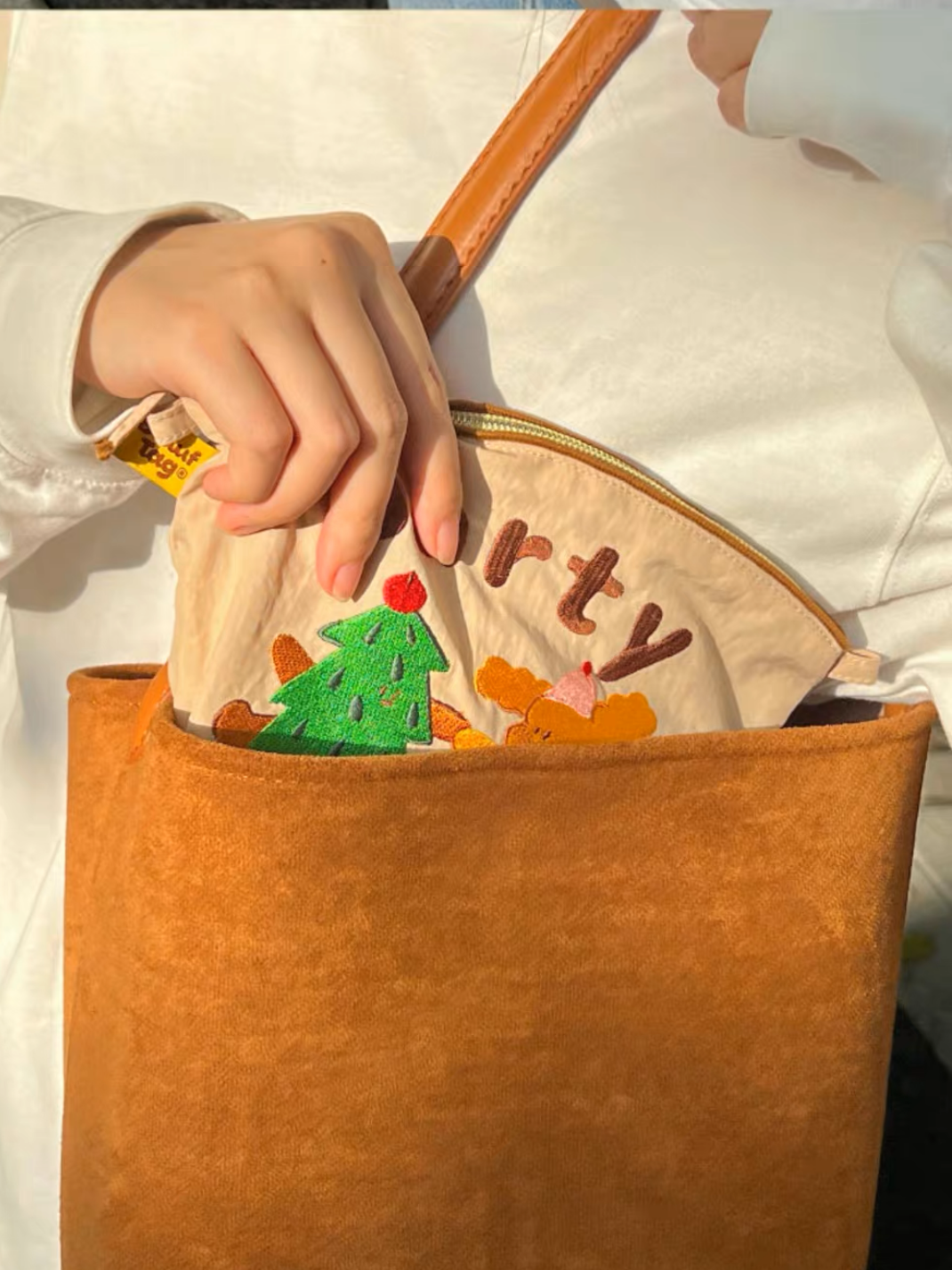 Cute illustration embroidery environmentally friendly cloth bag storage portable nylon cosmetic bag large capacity wash makeup brush clutch bag cartoon bear embroidered cosmetic bag