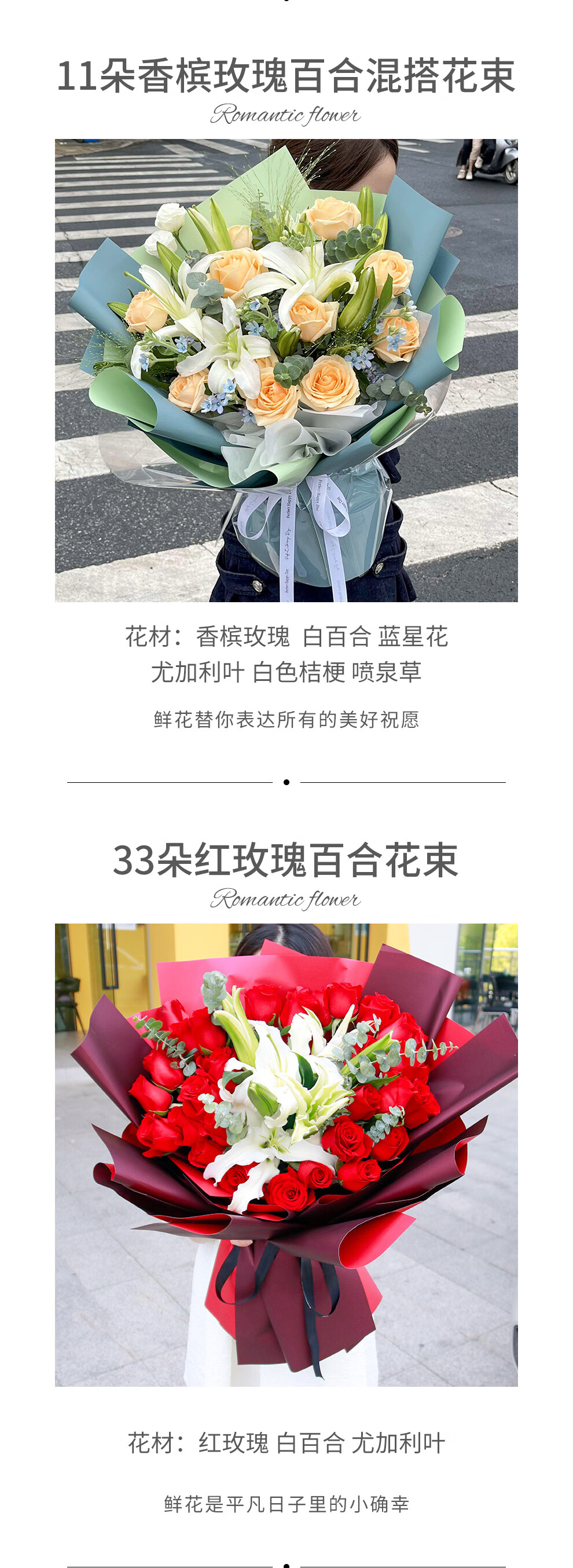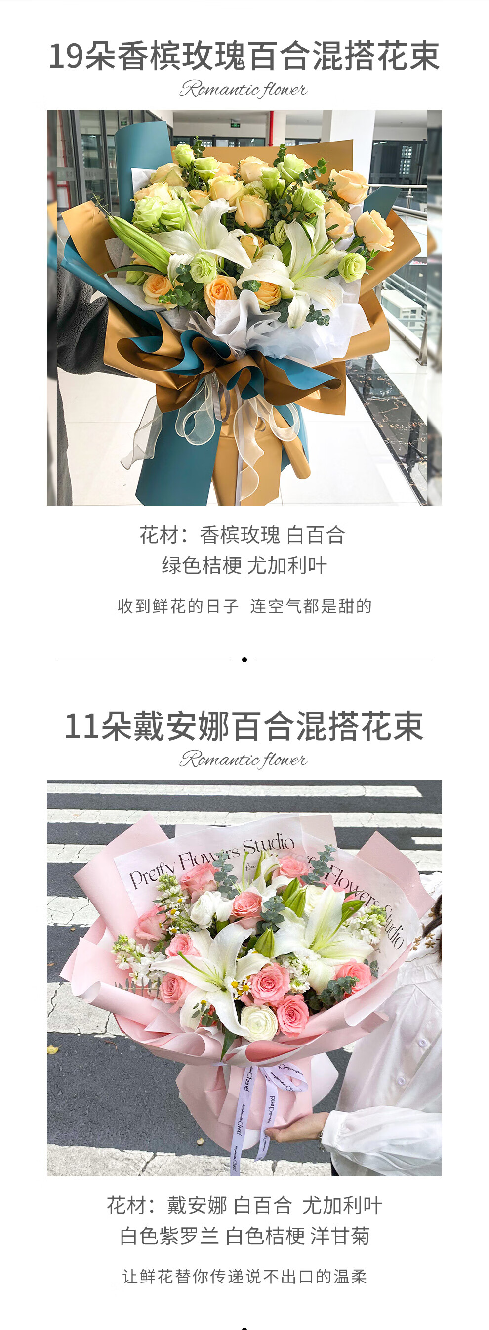Lingxiang Flower Express Champagne Rose Lily Bouquet for Girlfriend and Wife’s Birthday Gift Nationwide Delivery 19 Red Roses and Lily Mixed Bouquet