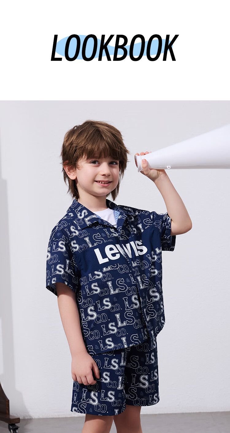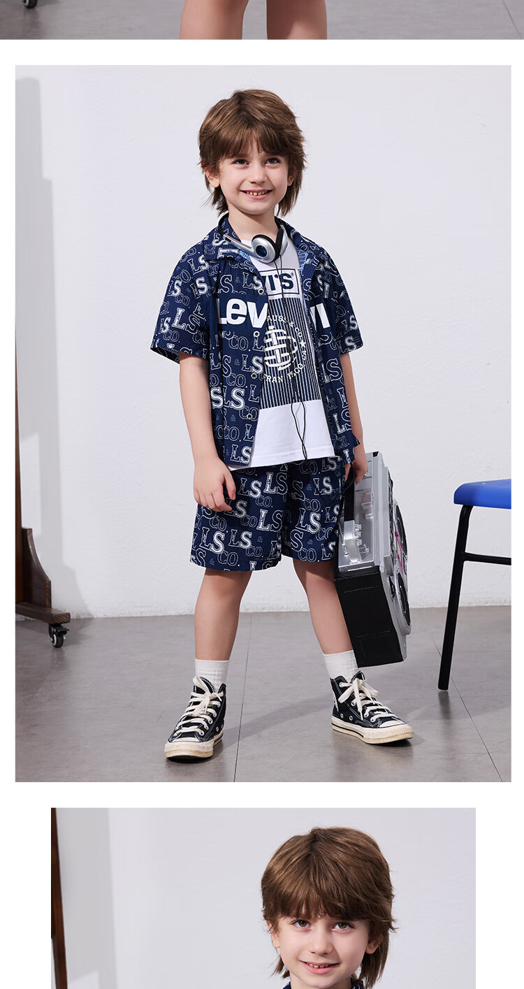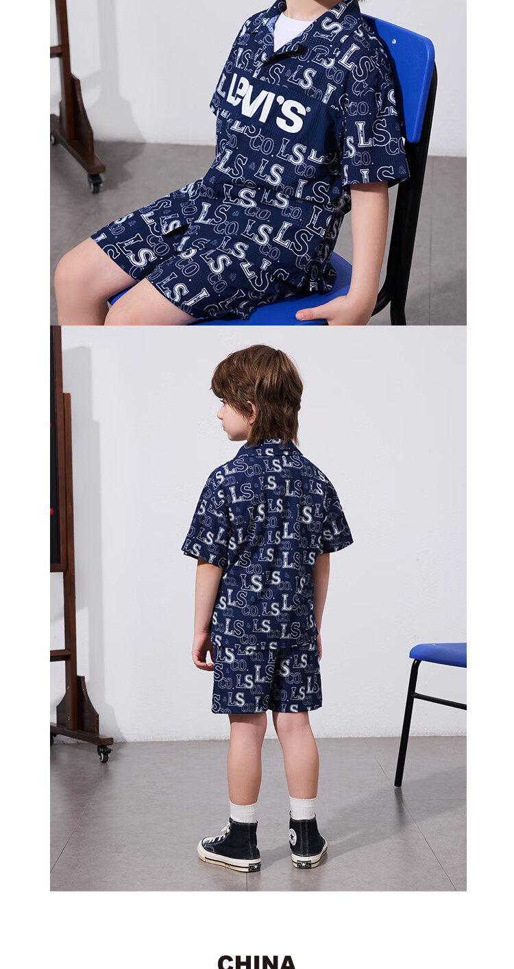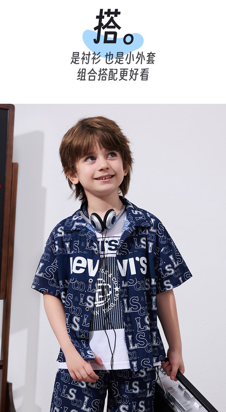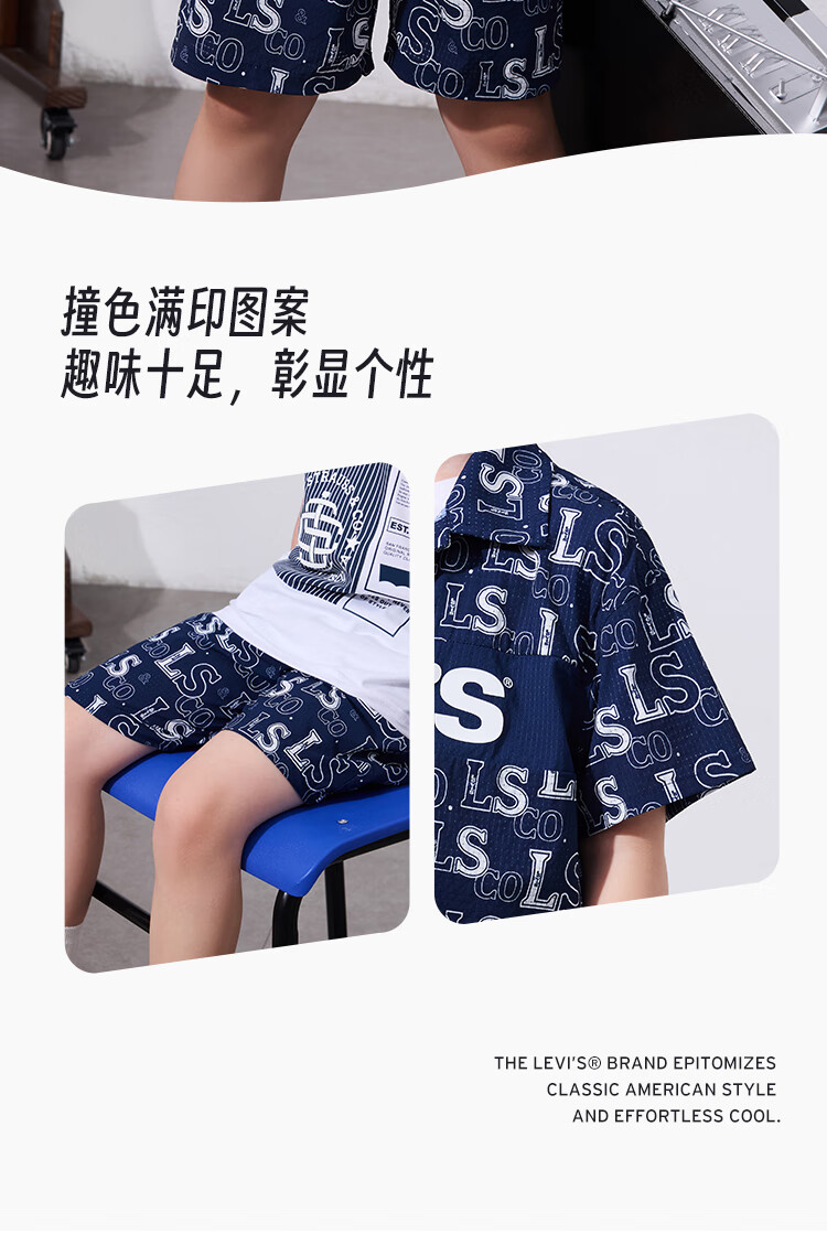 Levi's Levi's children's clothing, the same style as the mall, new summer style boys' full-print logo shirt, woven short-sleeved top, dark indigo 120/60, recommended height 110-116cm