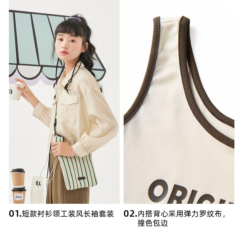Zihan (ZIHAN) Zihan short long-sleeved shirt and vest two-piece set for women summer Japanese commuting workwear suit beige S