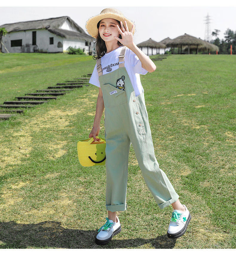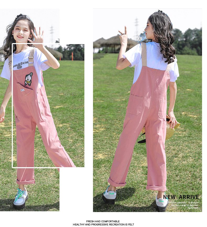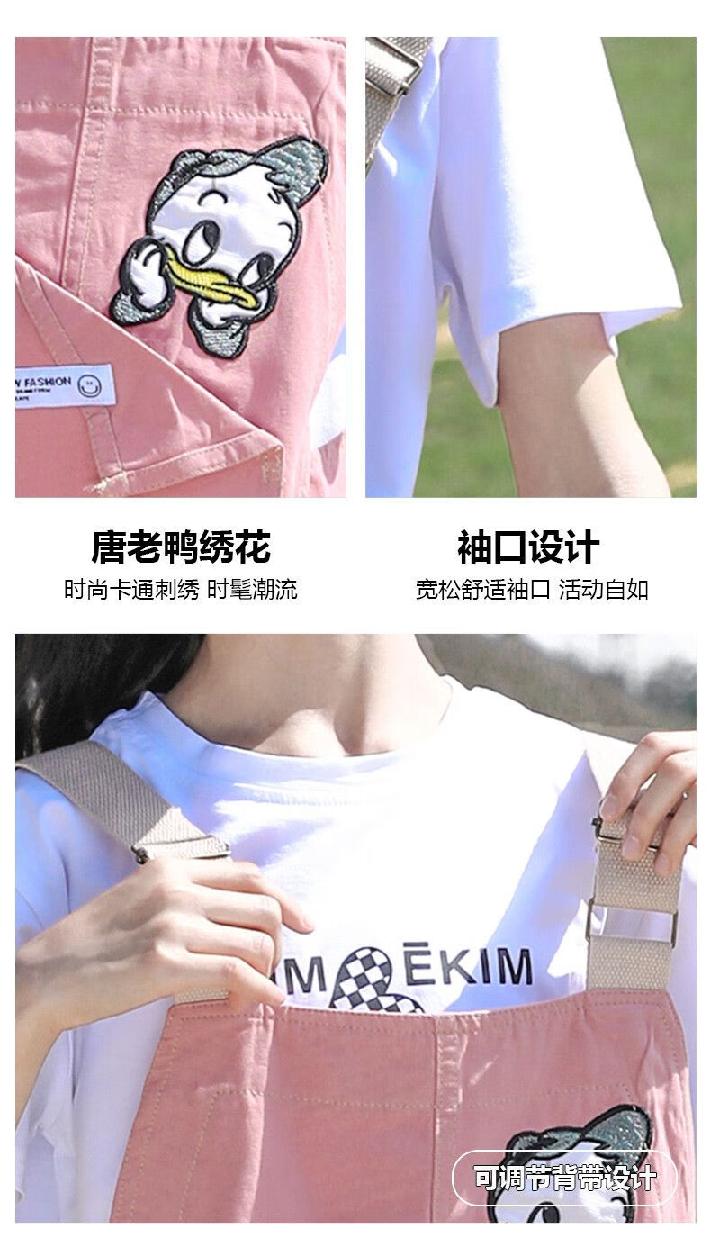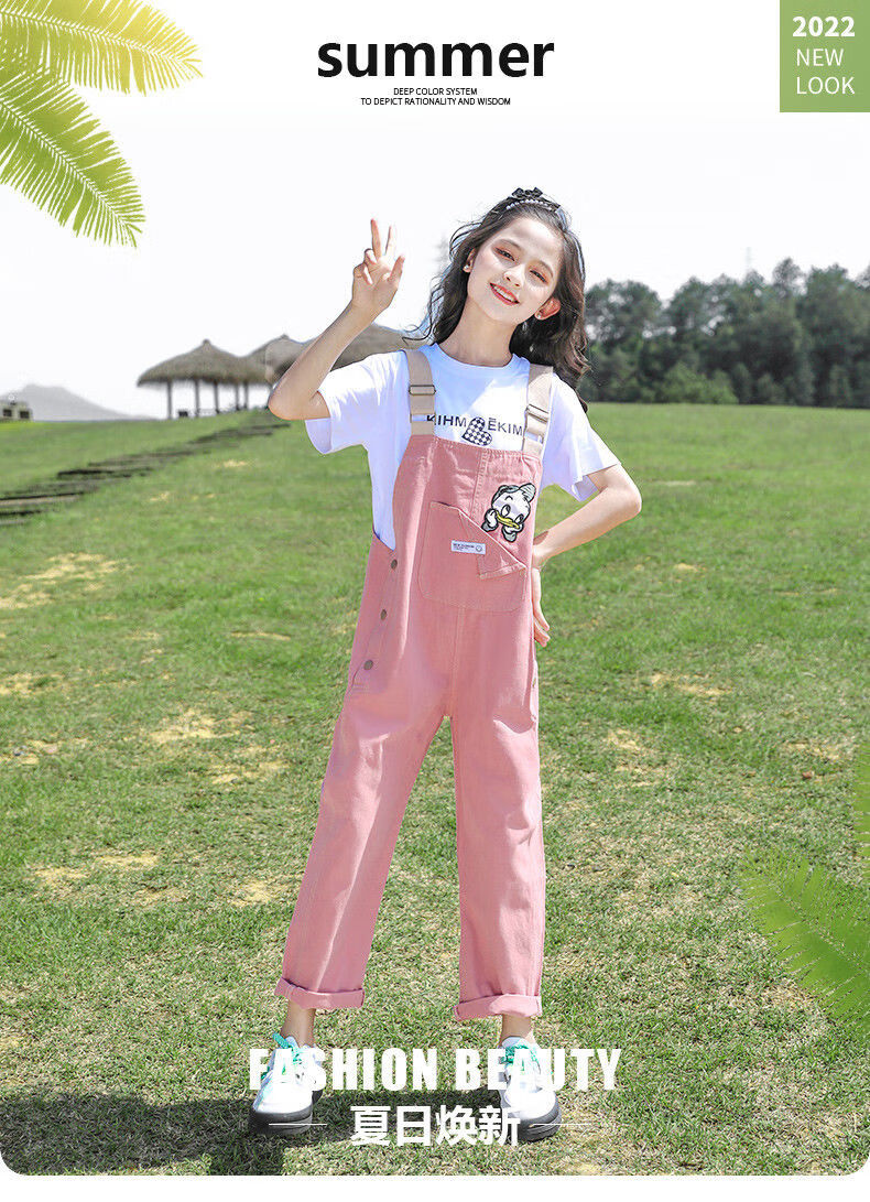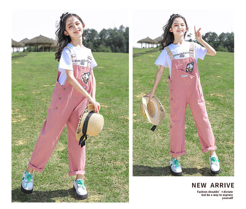 G.DUCKKIDS2025 new girls summer suit, cotton, western style, medium and large children's loose summer thin overalls two-piece set, Donald Duck overalls suit, pink 140
