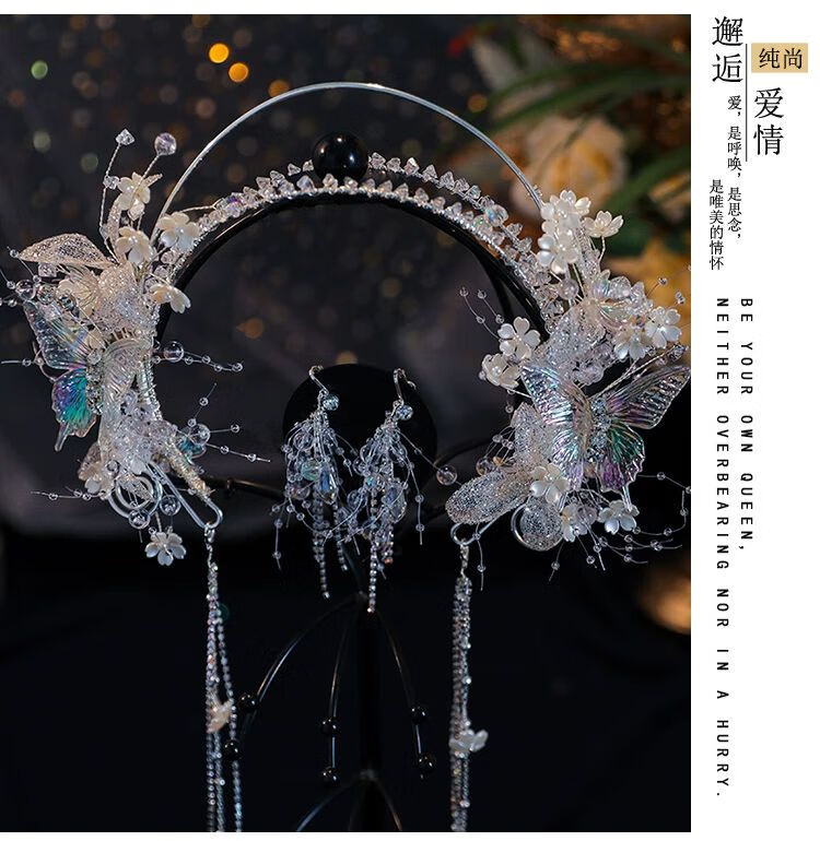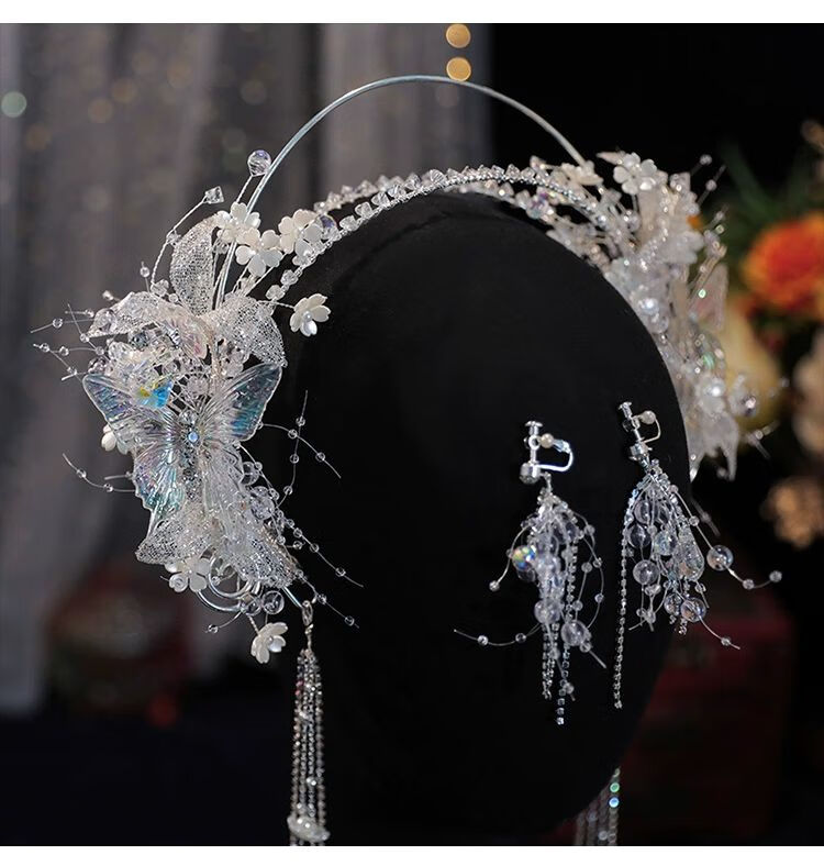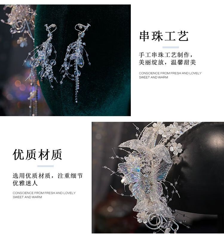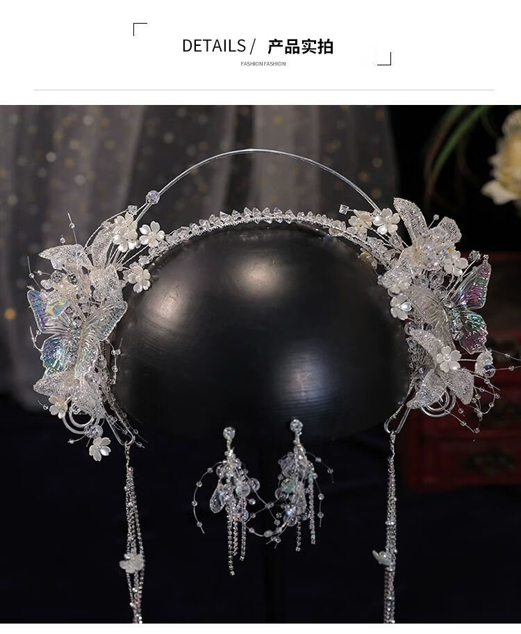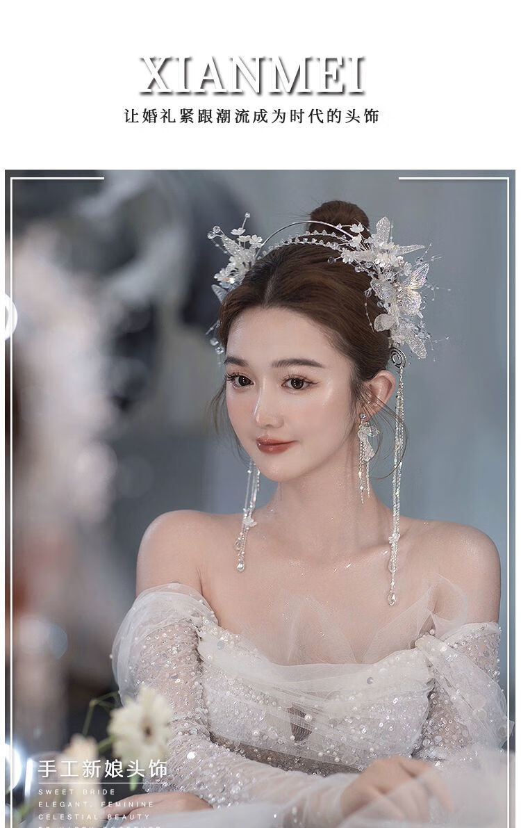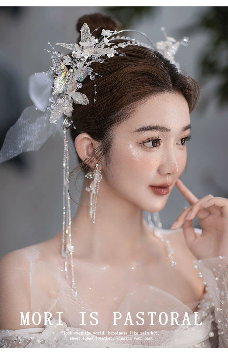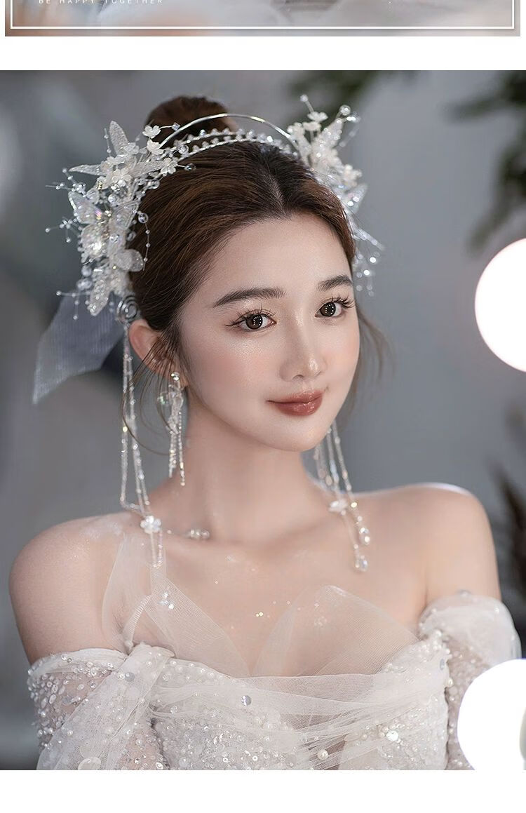 Cheng Liu bridal tiara, Korean crystal tassel bow headband, fairy white gauze saint crown wedding dress, wedding hair accessories, saint crown ear clip