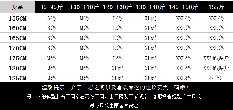 China (cm) 160-165/84-86 165-170 / 88-90 167-172 / 92-96 168-173 / 98-102 170-176 / 106-110
