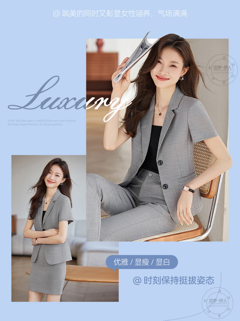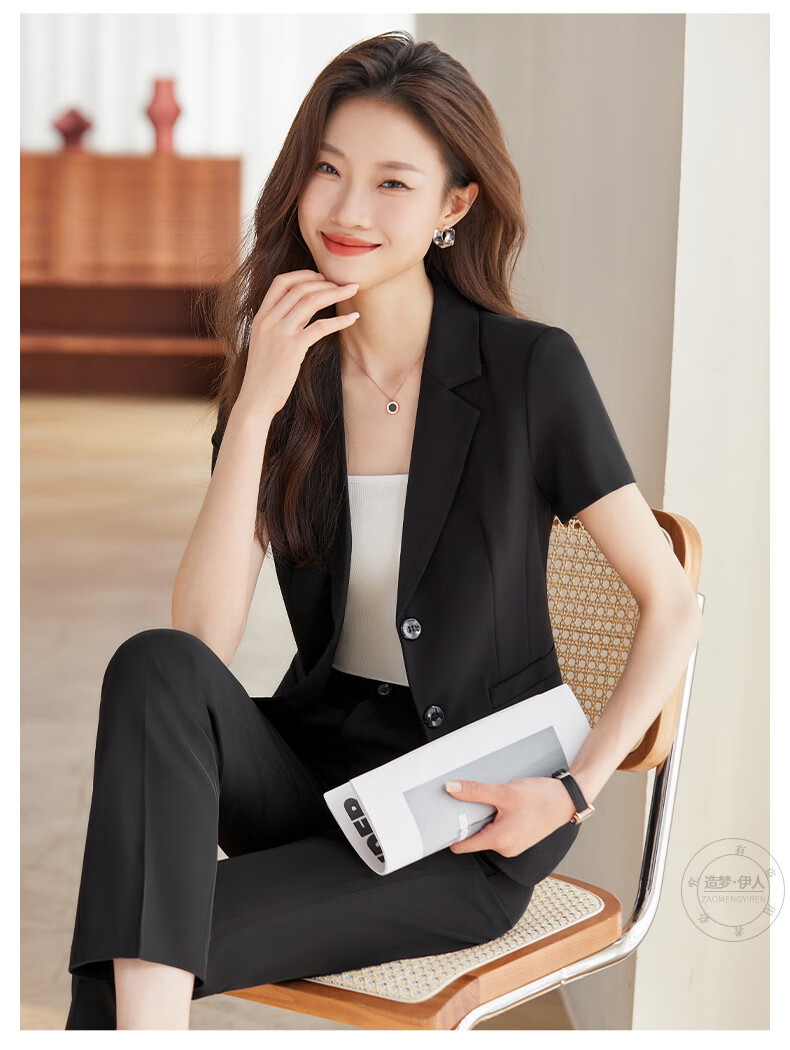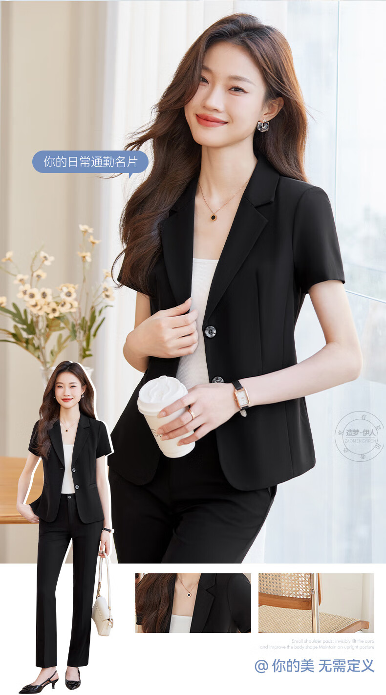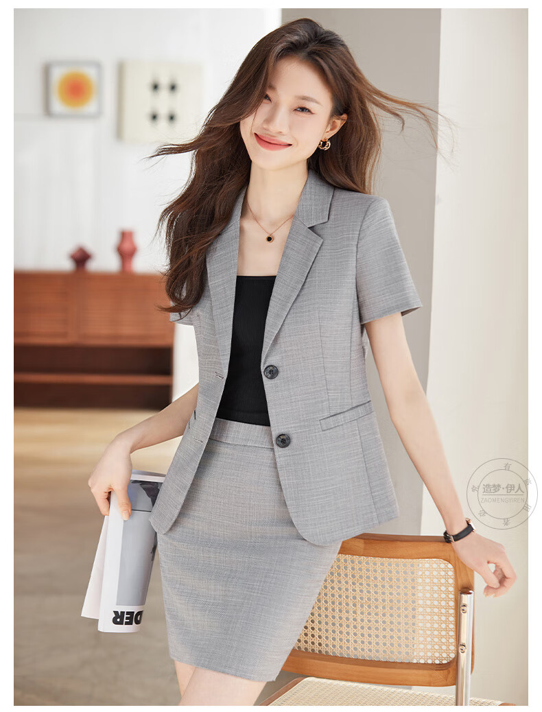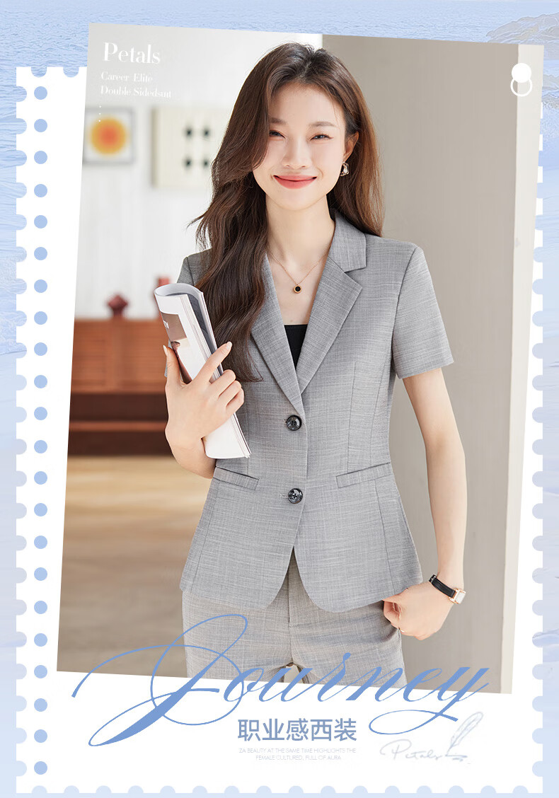 Dream Yiren short-sleeved suit for women summer thin high-end professional OL commuting temperament business formal suit for women gray suit + pants (black suspenders) XL