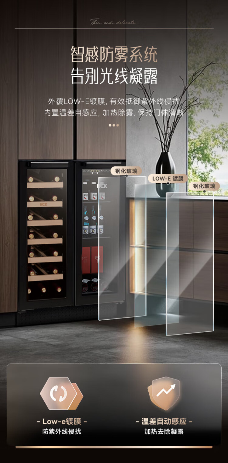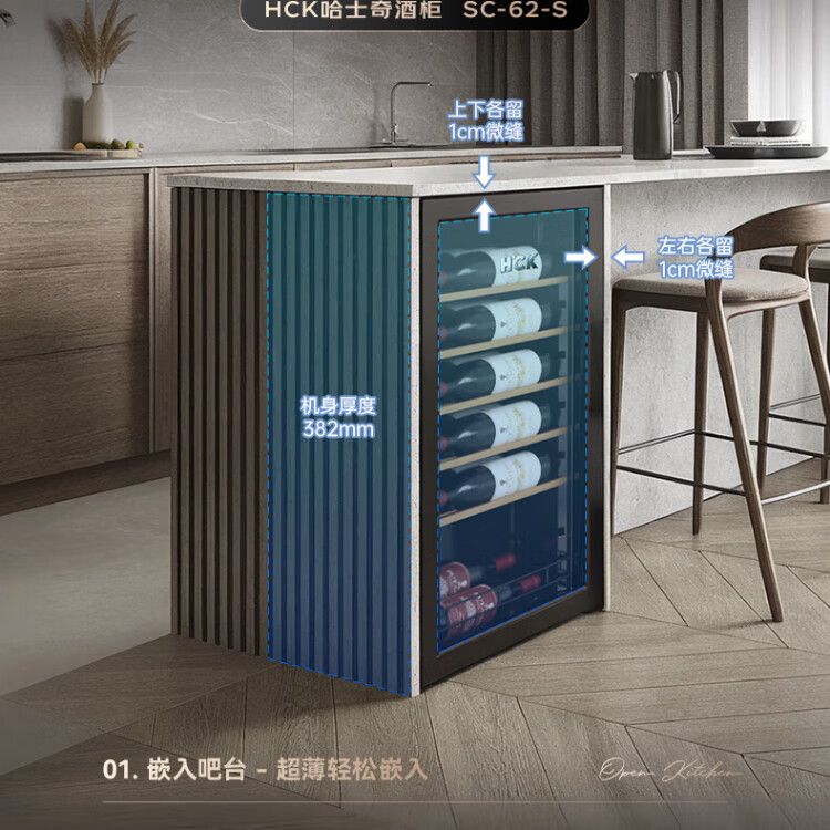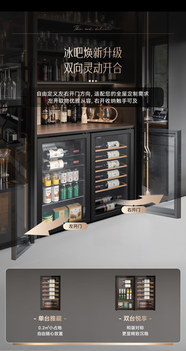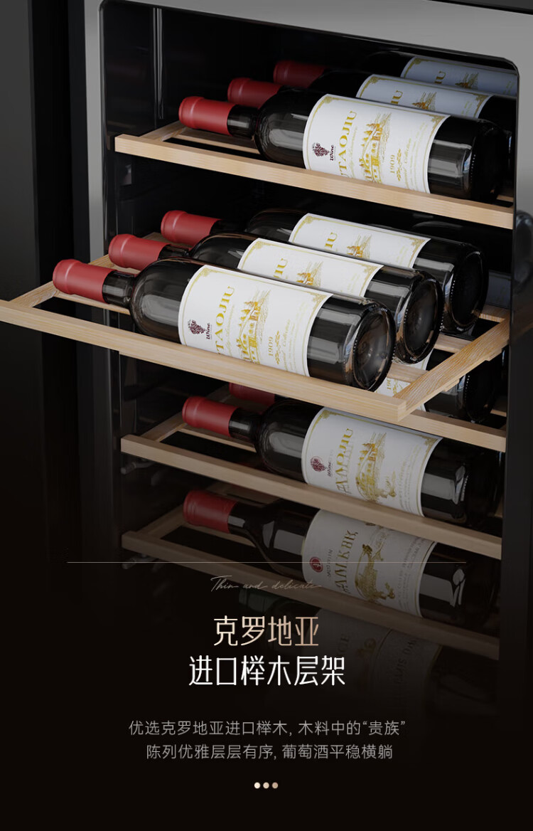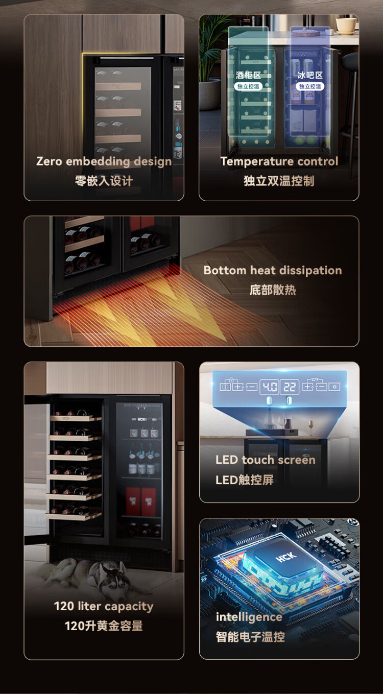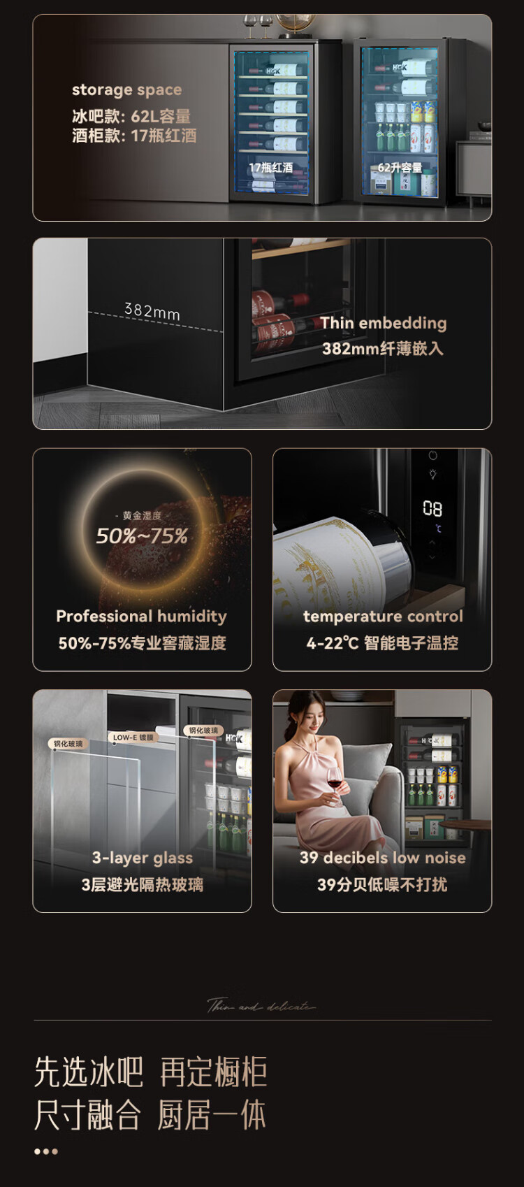 HCK Husky 62L ultra-thin built-in ice bar first-class energy efficiency mini refrigerator red wine cabinet fresh cabinet constant temperature and humidity refrigerated display tea cabinet 62/120 series classic 62L wine cabinet model丨ultra-thin built-in丨starry sky black
