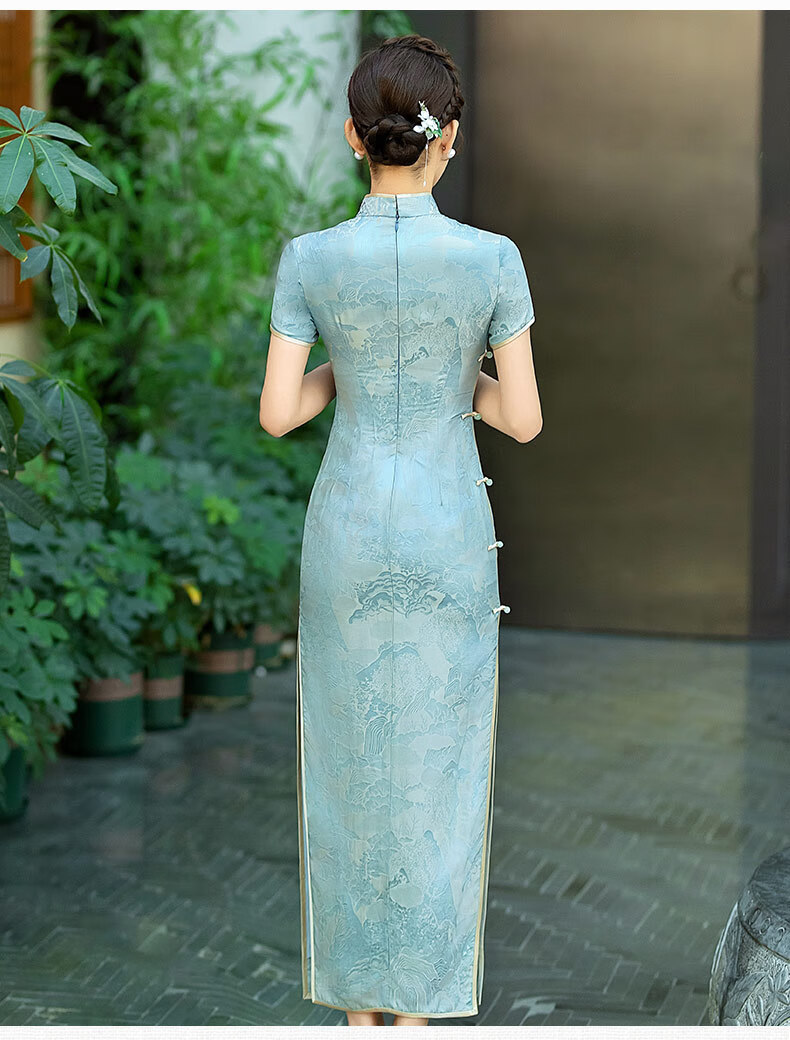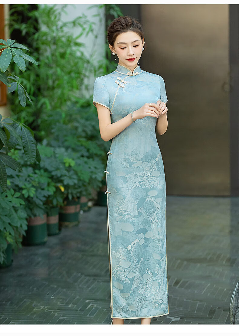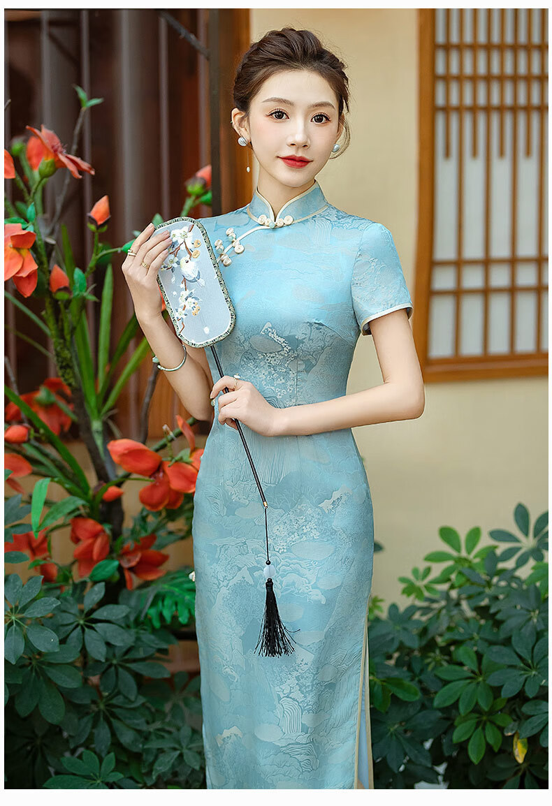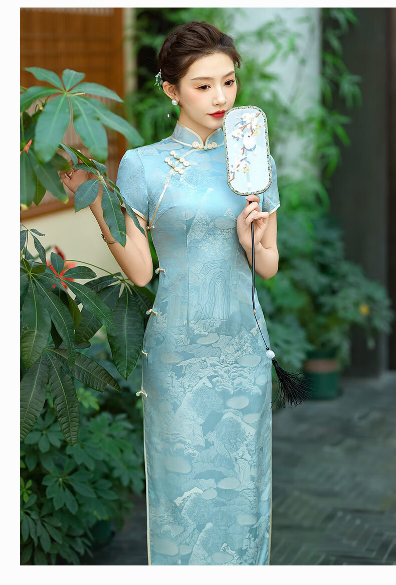 Gu Wainian silk cheongsam long new improved silk jacquard cheongsam high-end temperament slim mulberry silk dress blue M