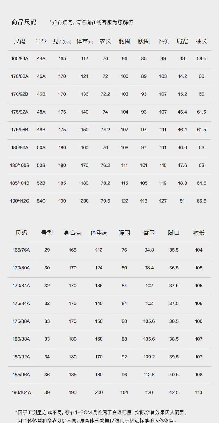 China (cm) 160-165/84-86 165-170 / 88-90 167-172 / 92-96 168-173 / 98-102 170-176 / 106-110