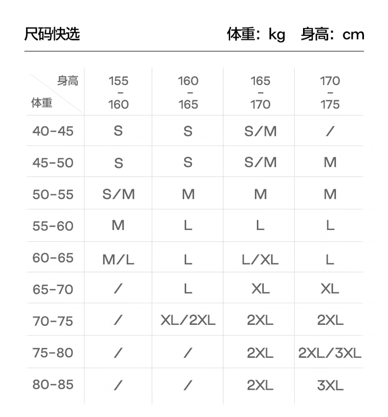 China (cm) 160-165/84-86 165-170 / 88-90 167-172 / 92-96 168-173 / 98-102 170-176 / 106-110