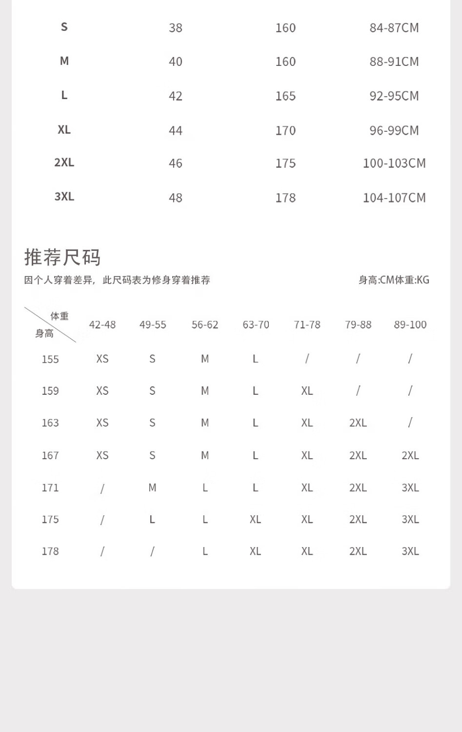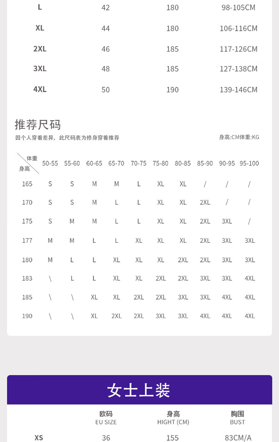 China (cm) 160-165/84-86 165-170 / 88-90 167-172 / 92-96 168-173 / 98-102 170-176 / 106-110