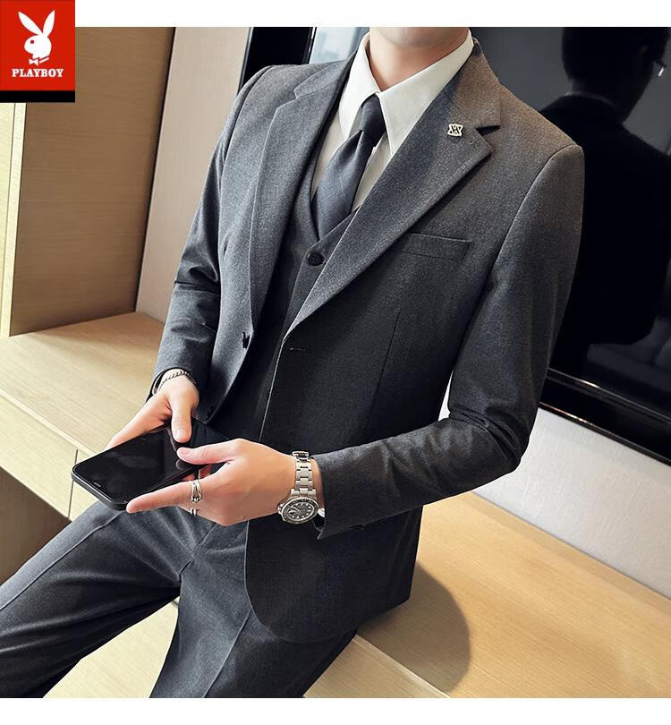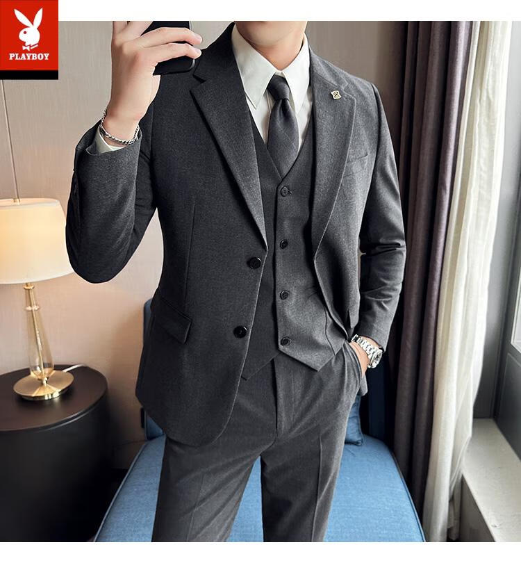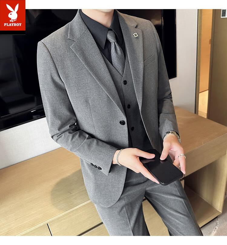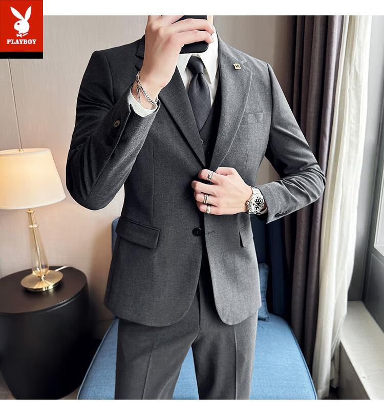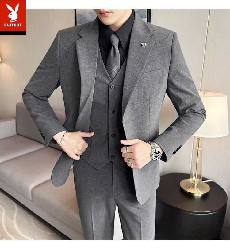 Playboy suit suit men's high-end double-button casual groom wedding dress men's business formal fit suit jacket medium gray suit (suit + vest + pants) XL 120-135Jin Jin equals 0.5 kg