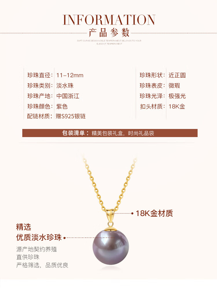 Queen of Pearls Nine Purple Lihuo 18K Gold 11-12mm Freshwater Purple Pearl Pendant with Silver Chain Birthday Gift for Girls
