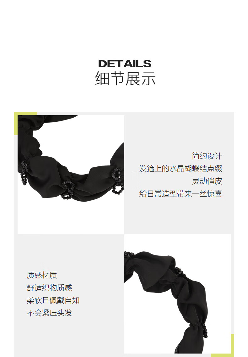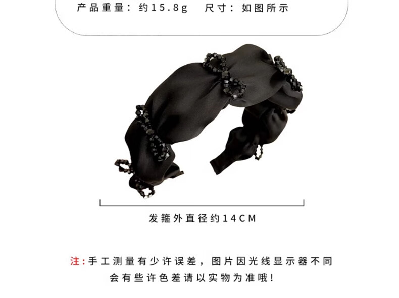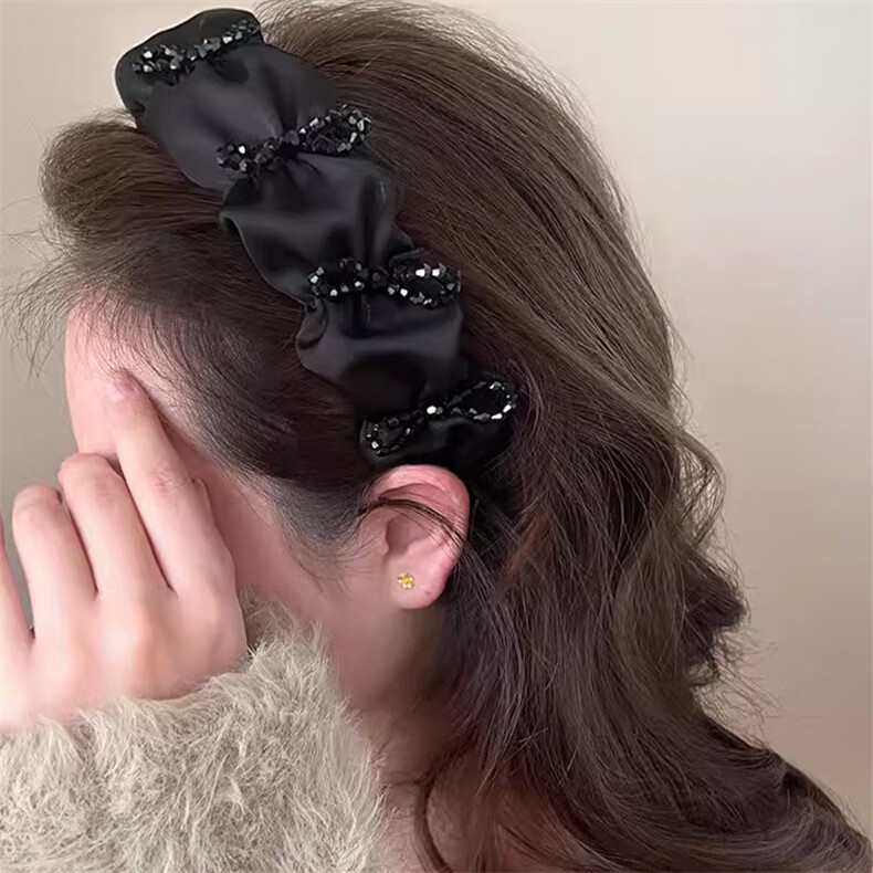 Jinhehe black high-end wide-brimmed pleated crystal hairband for women with high skull temperament niche crushed hairpin new hair accessories black satin rhinestone bow