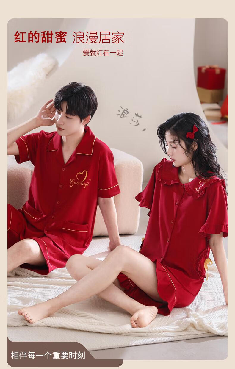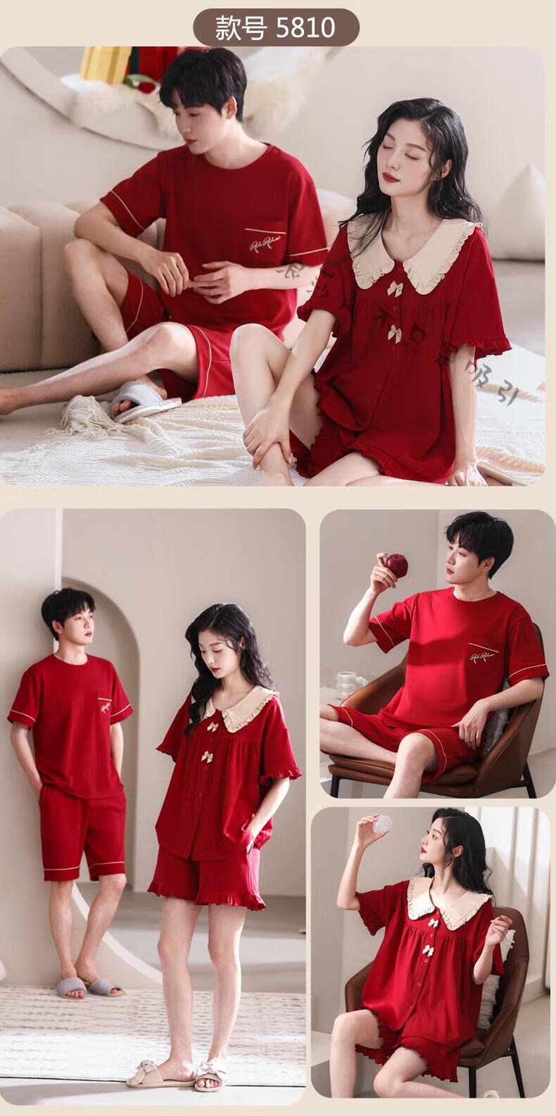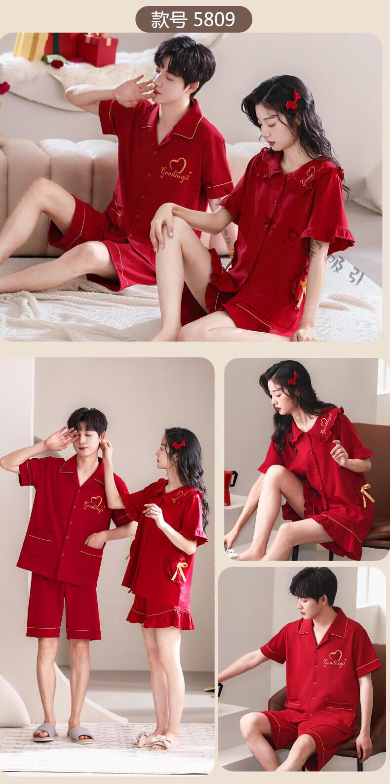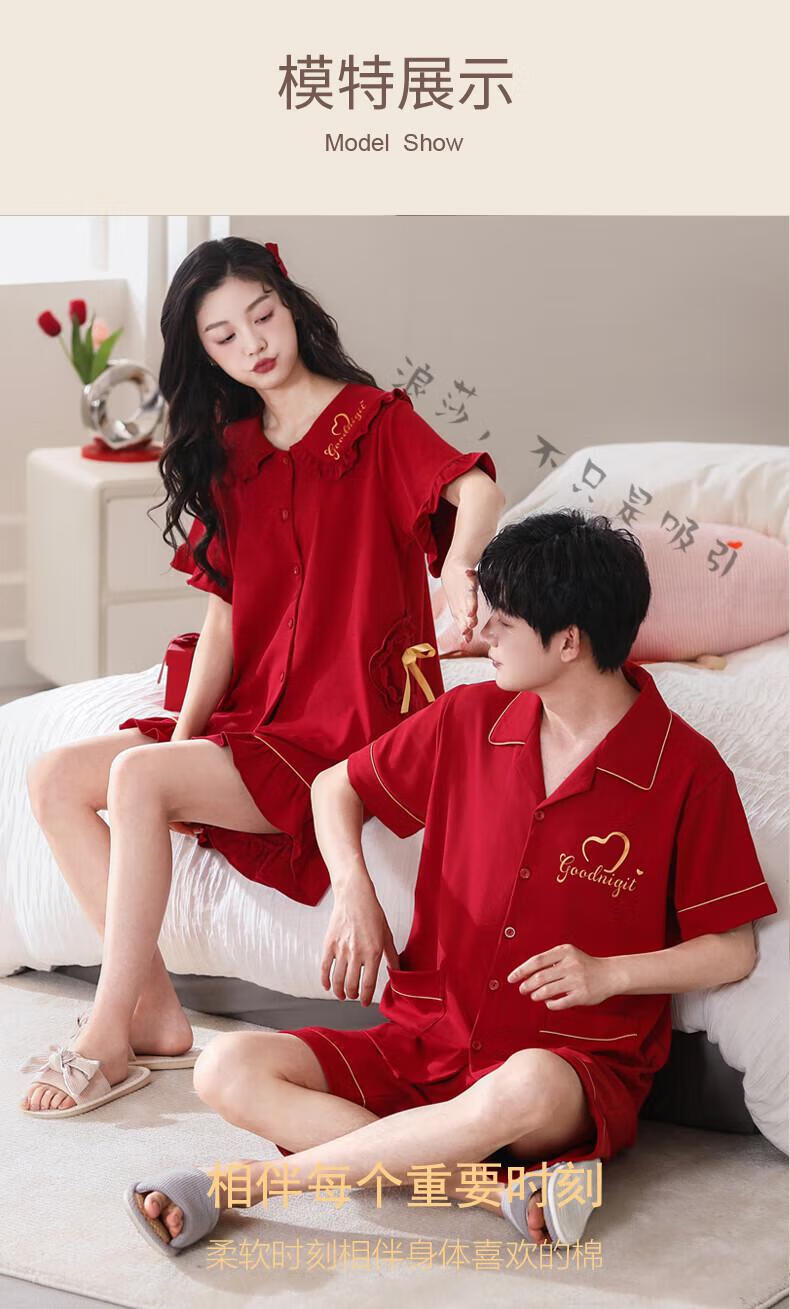 LangSha wedding couple pajamas summer pure cotton with chest pads for one man and one woman red wedding high-end gift box home wear set 5812 couple (with chest pads) female XL + male L