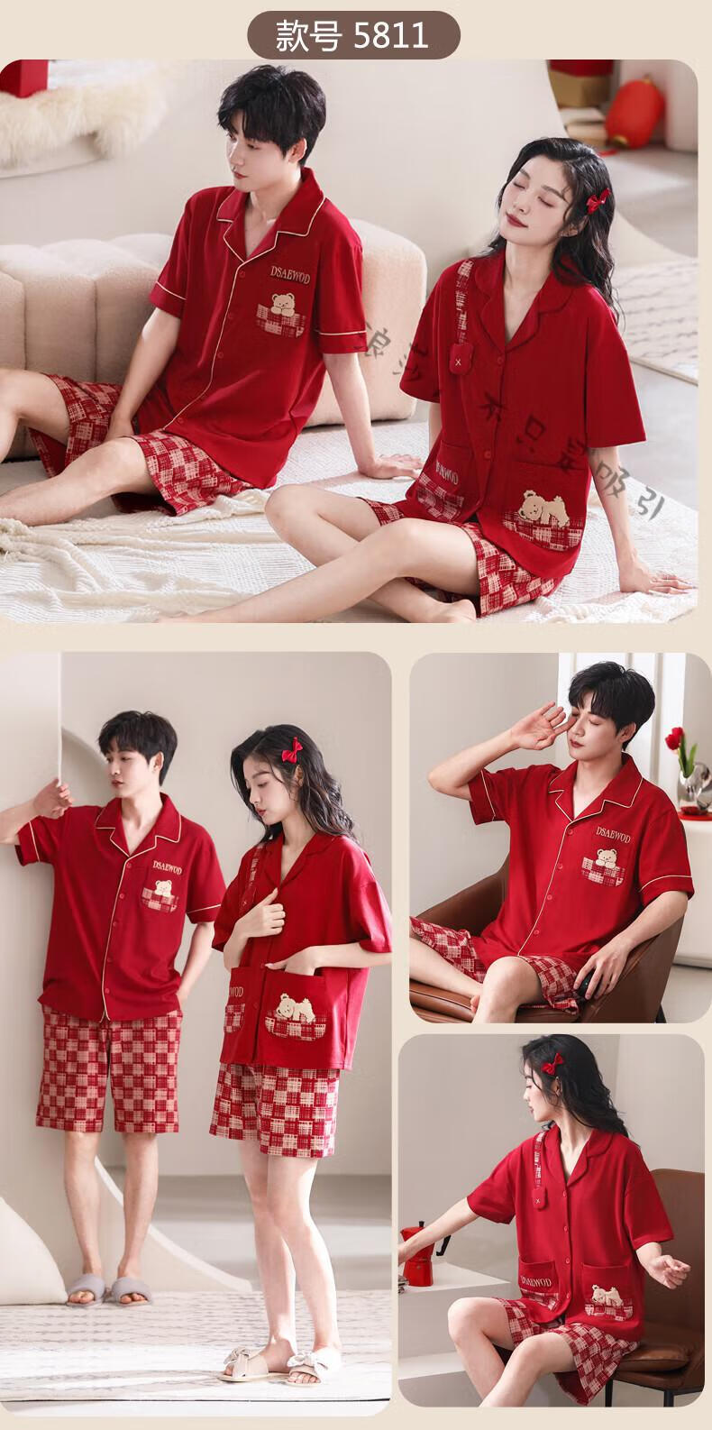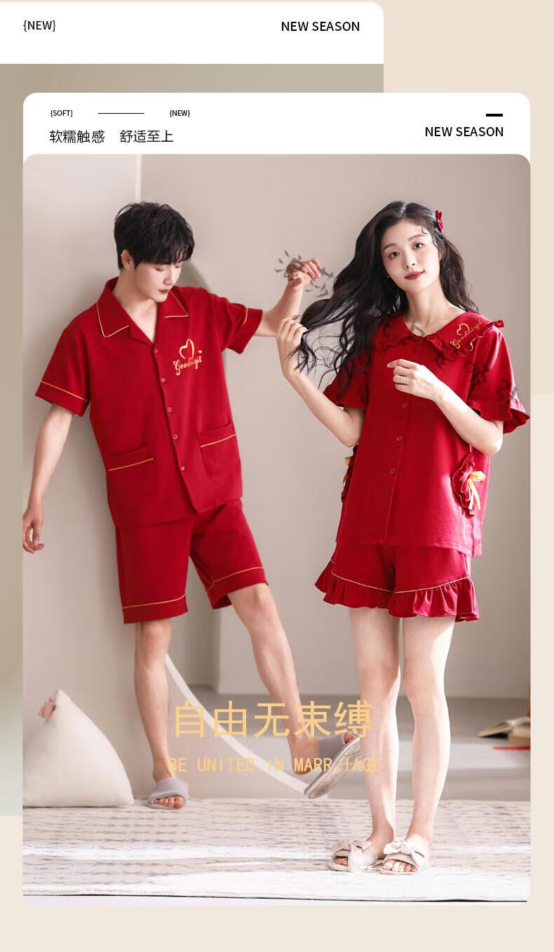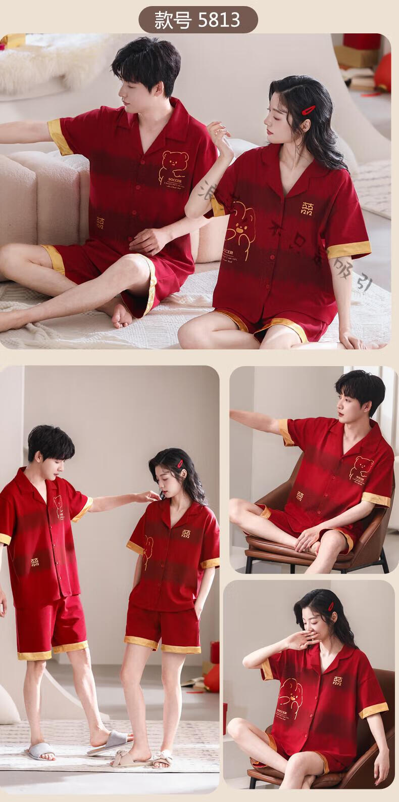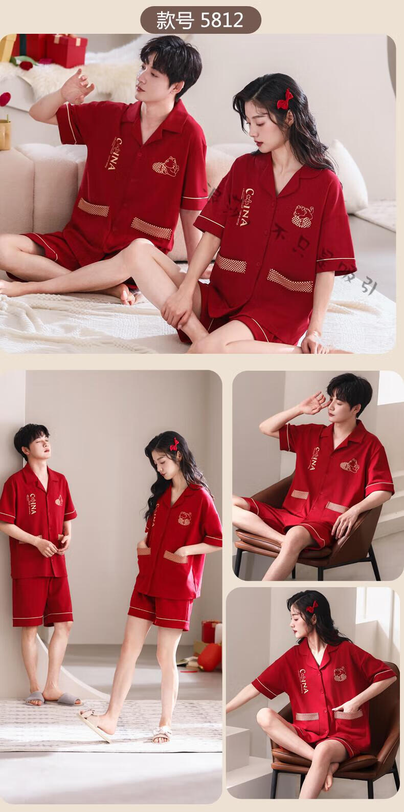 LangSha wedding couple pajamas summer pure cotton with chest pads for one man and one woman red wedding high-end gift box home wear set 5812 couple (with chest pads) female XL + male L