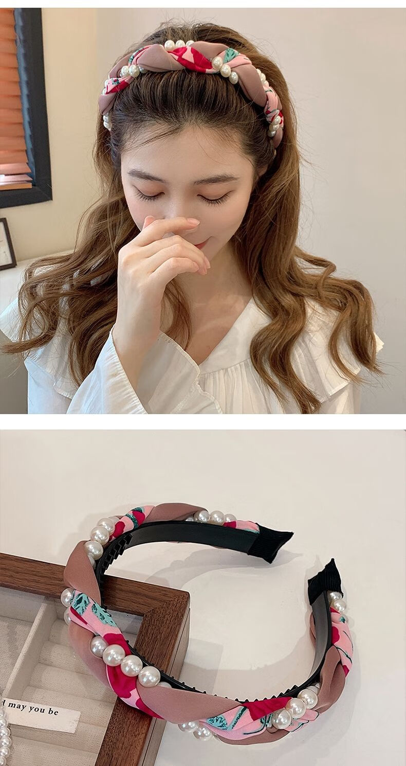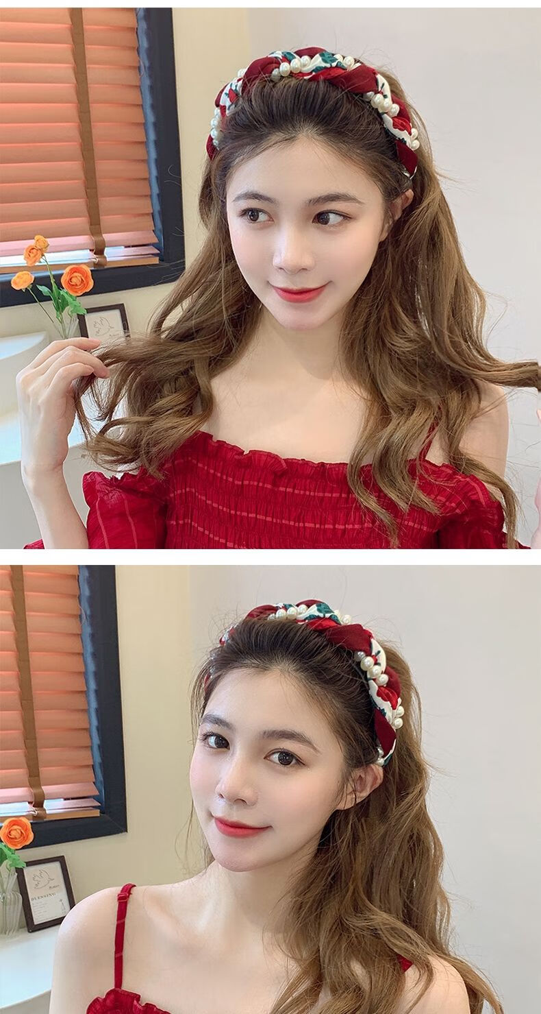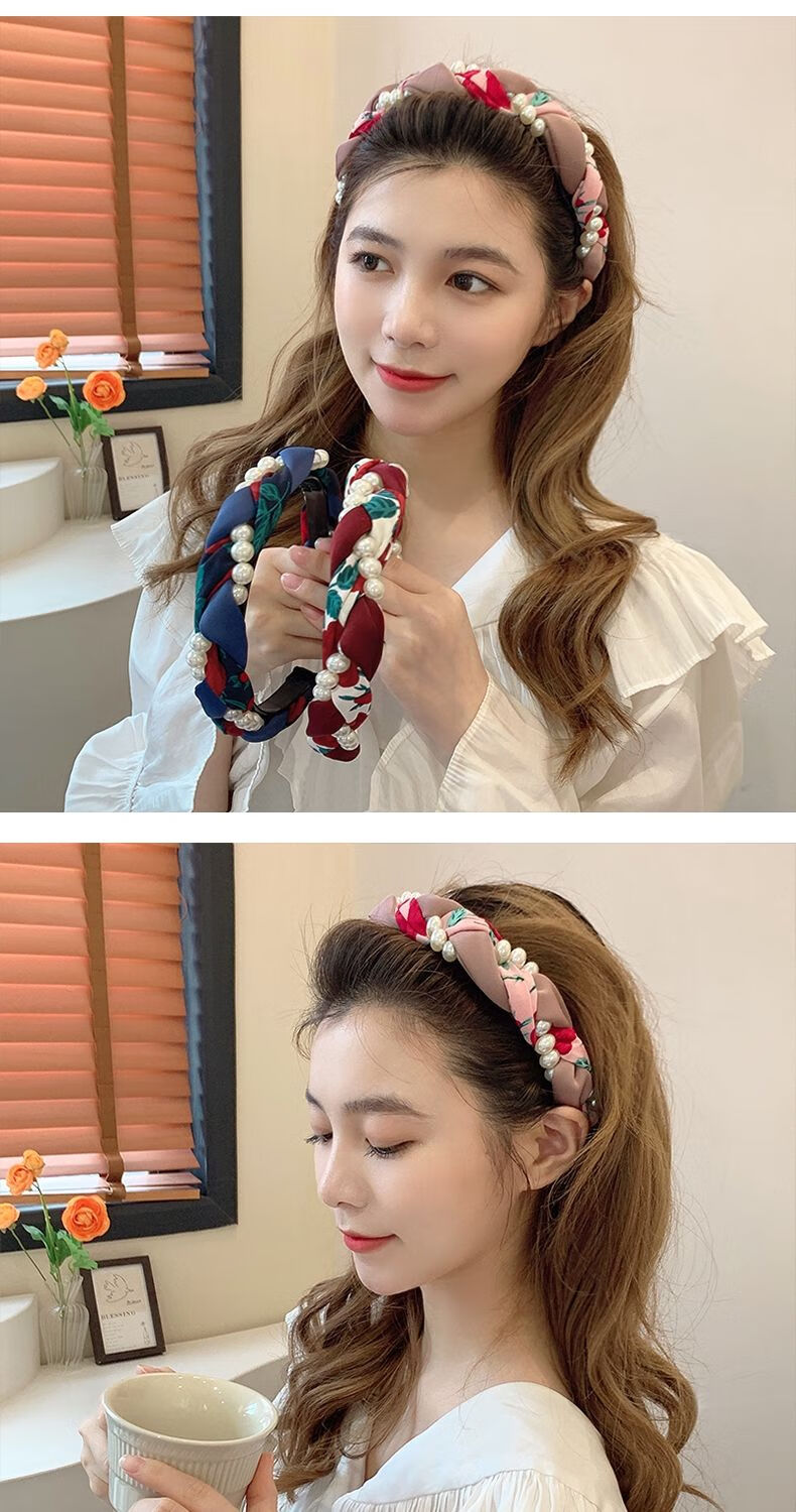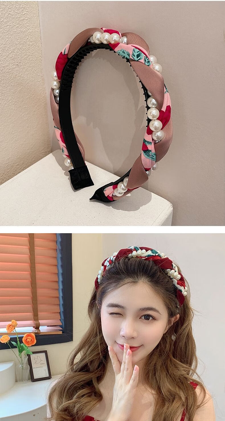 Beautiful Princess Korean version of high-end retro pearl twist headband, feminine wide-border non-slip toothed hairpin headband, high-end headwear 1# pearl twist red