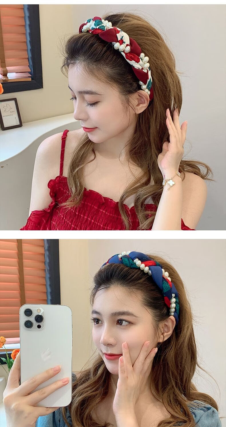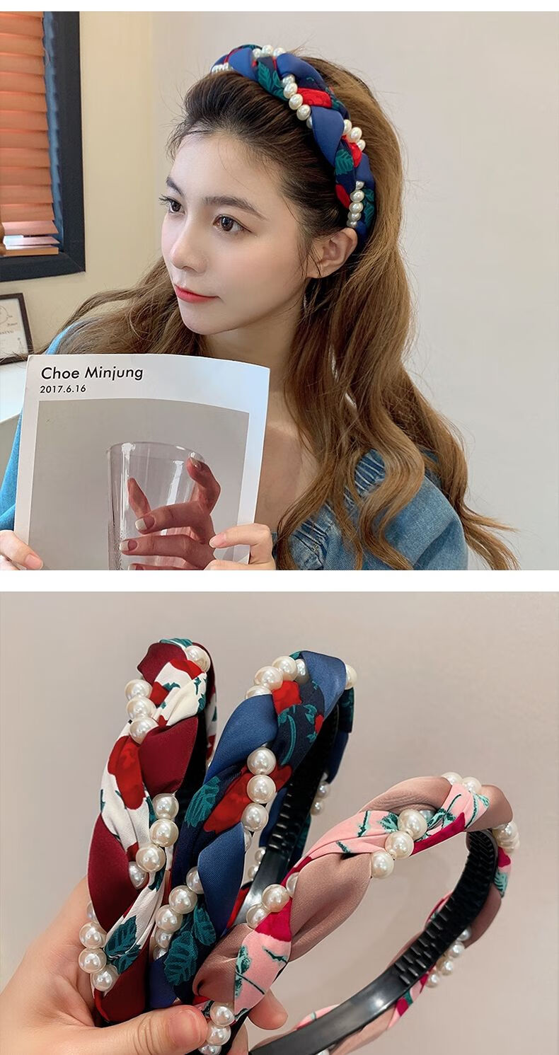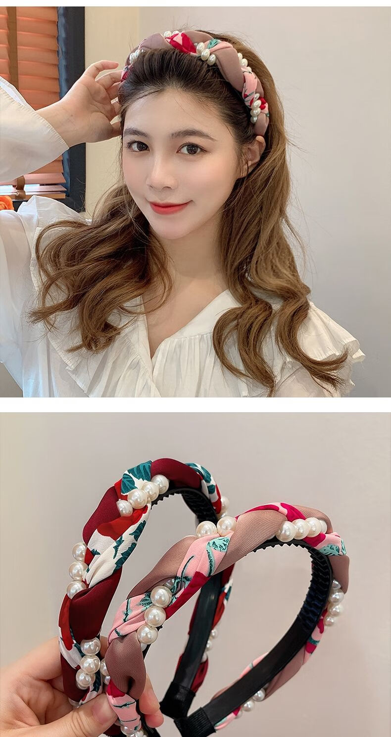 Beautiful Princess Korean version of high-end retro pearl twist headband, feminine wide-border non-slip toothed hairpin headband, high-end headwear 1# pearl twist red