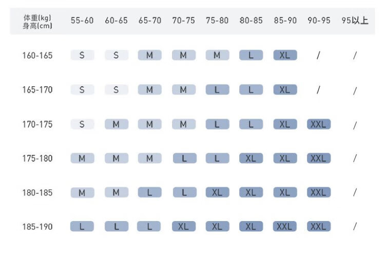 China (cm) 160-165/84-86 165-170 / 88-90 167-172 / 92-96 168-173 / 98-102 170-176 / 106-110