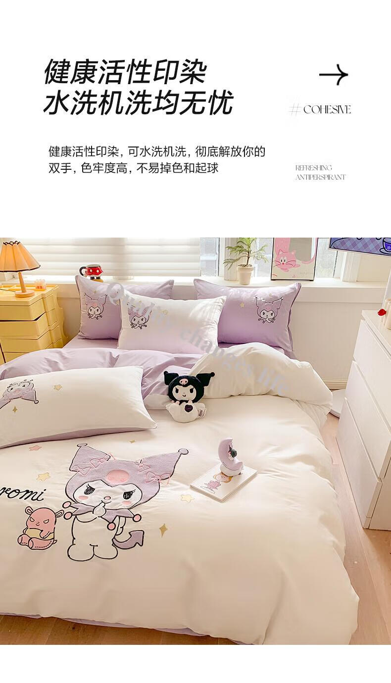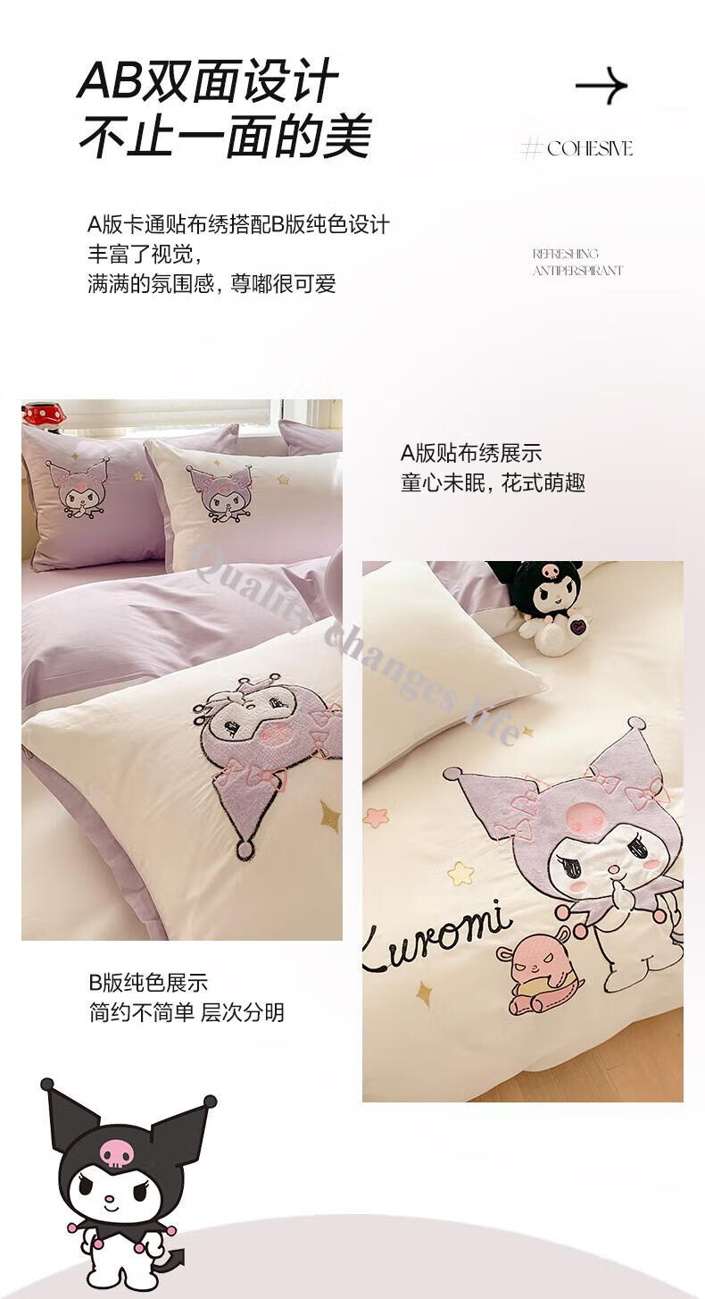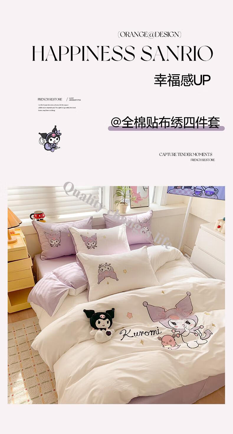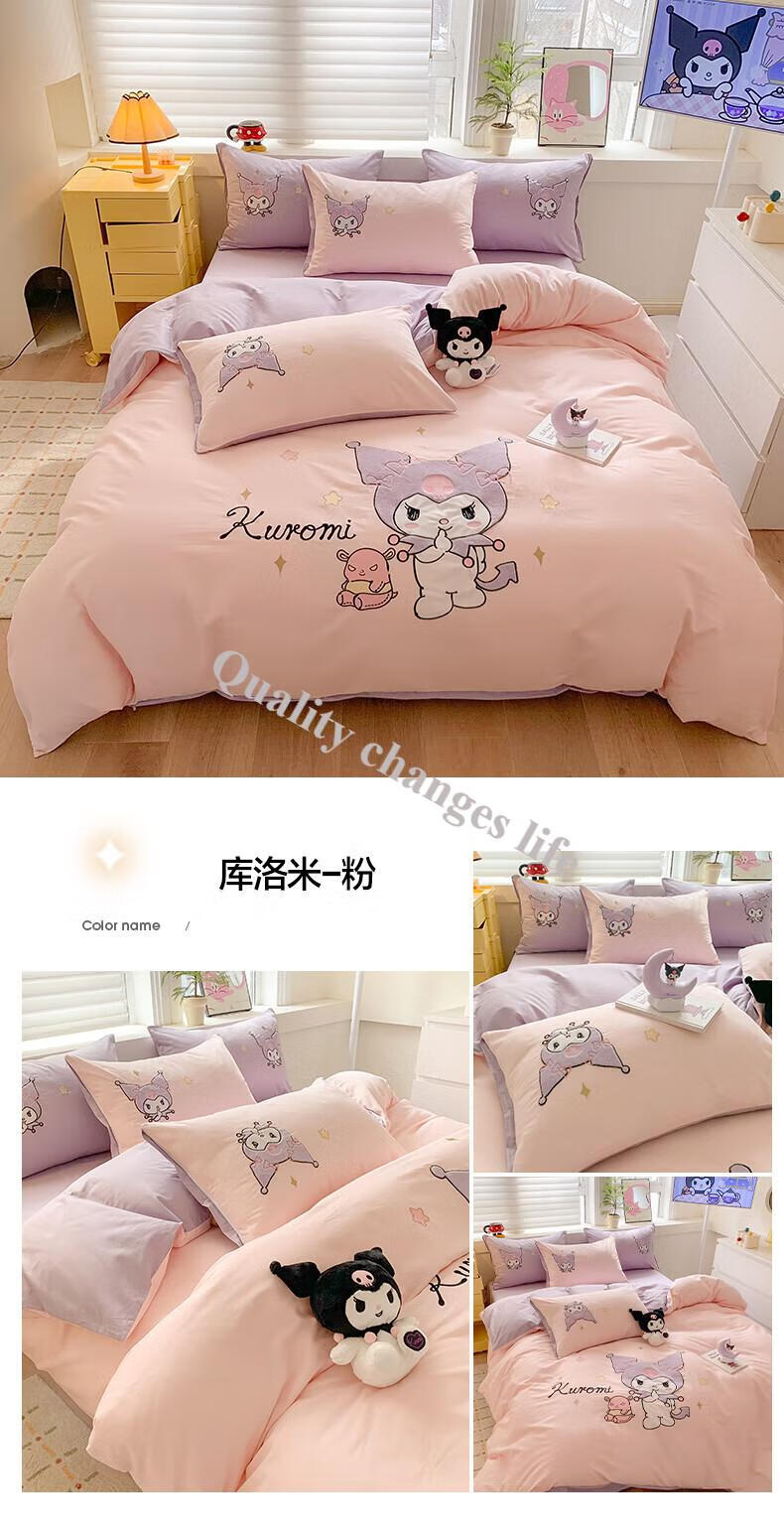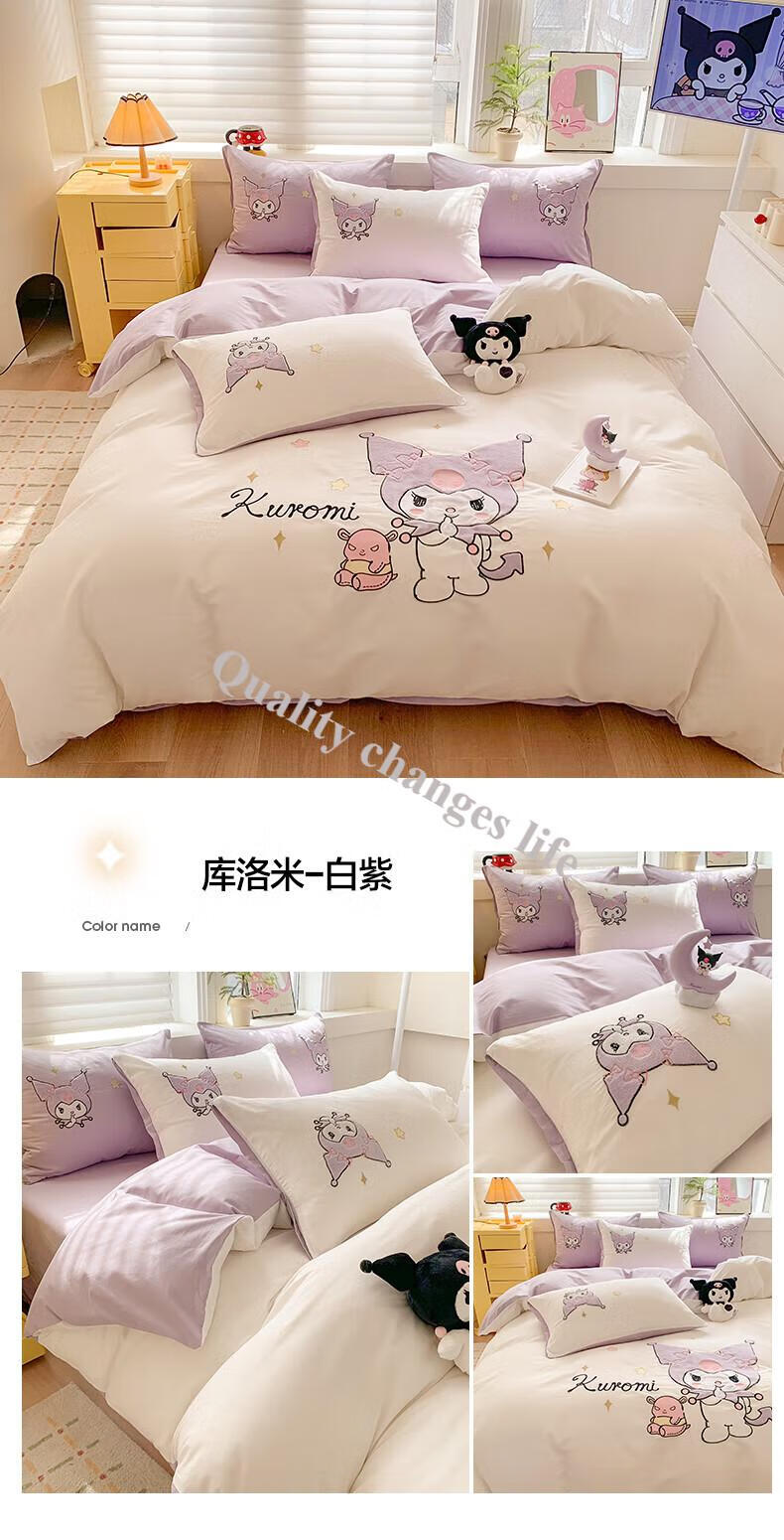 Mercury Series Home Textiles Cartoon Cute Kuromi Cotton Four-piece Set Pure Cotton Quilt Cover Dormitory Sheet Three-piece Set Bedding Camp Kuromi-White Purple 1.5m Sheet Style Four-piece Set