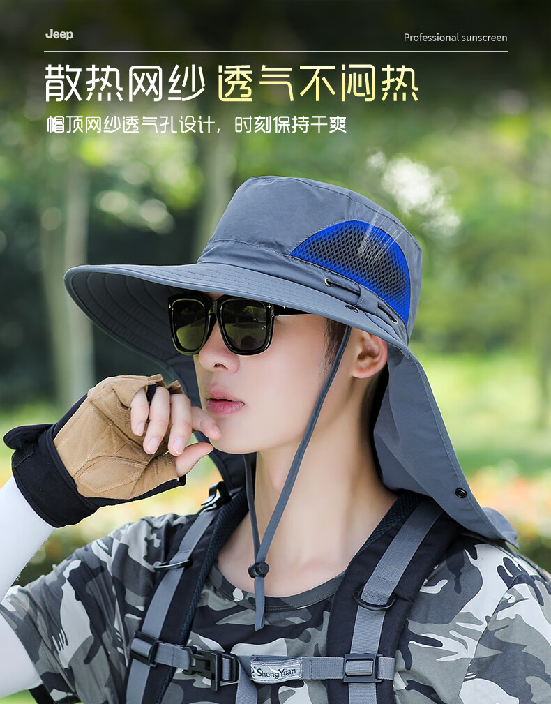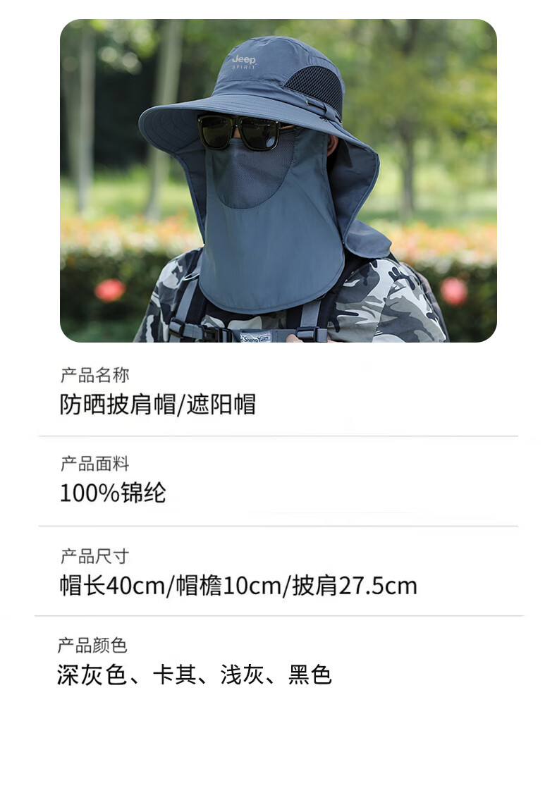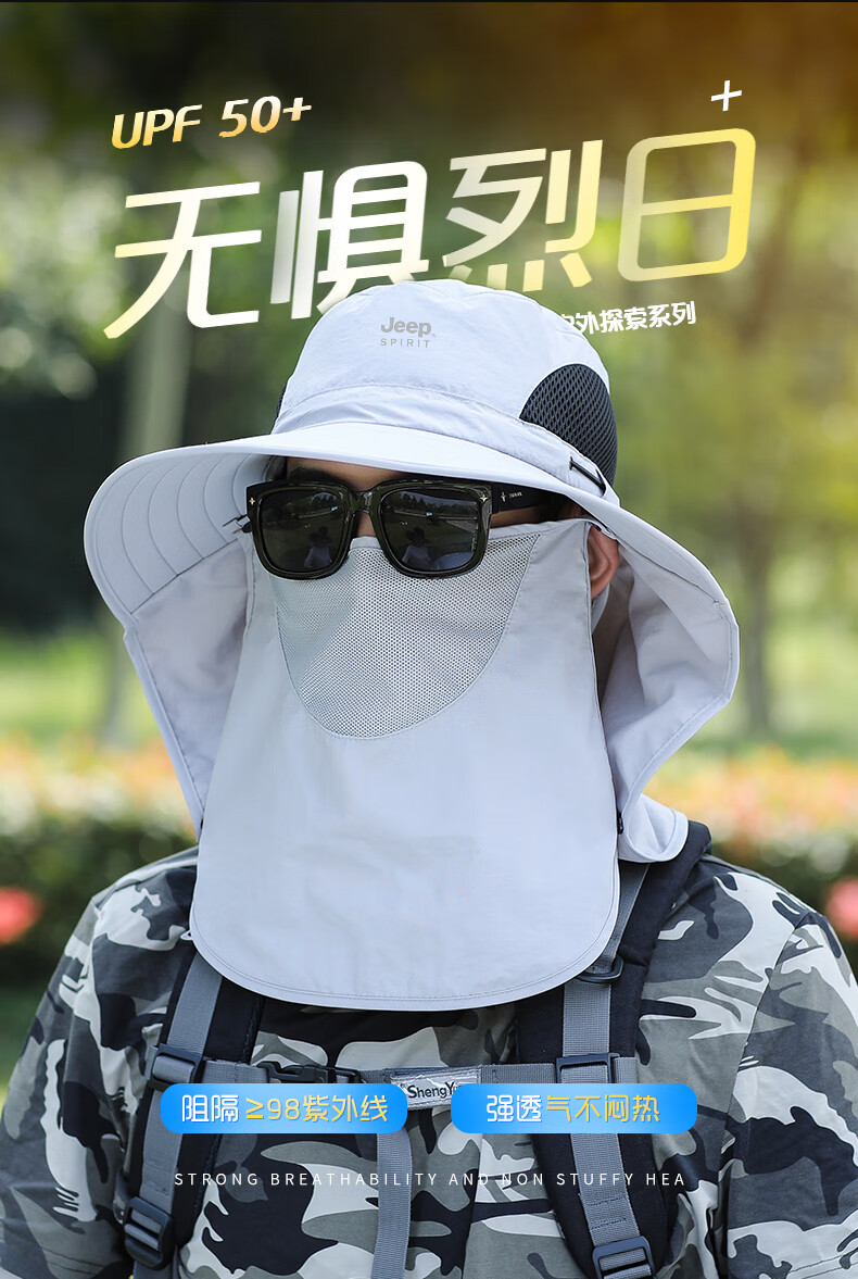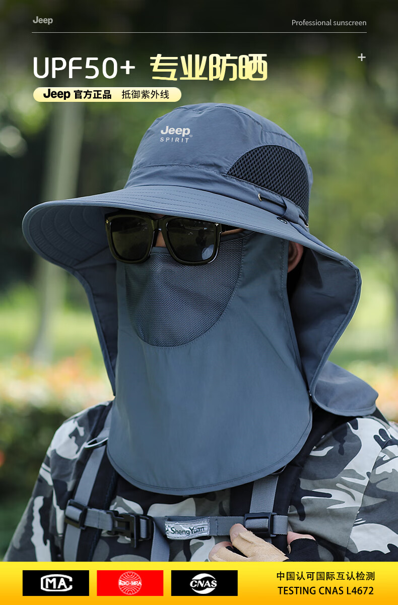 JEEP SPIRIT sun protection hat men's summer sun hat mask integrated neck protection fishing hat outdoor waterproof sun hat covering the whole face dark gray one size fits all adjustable