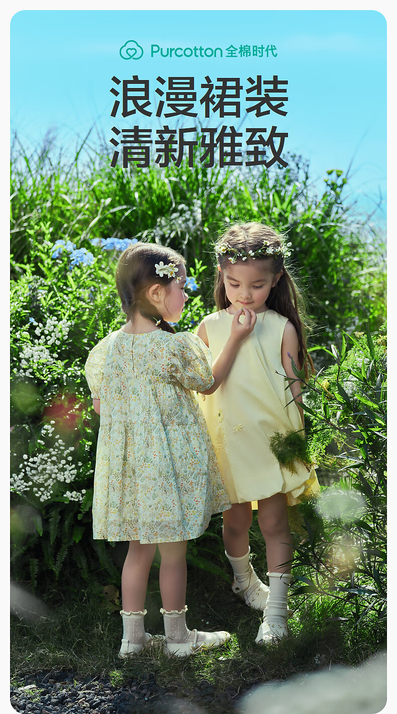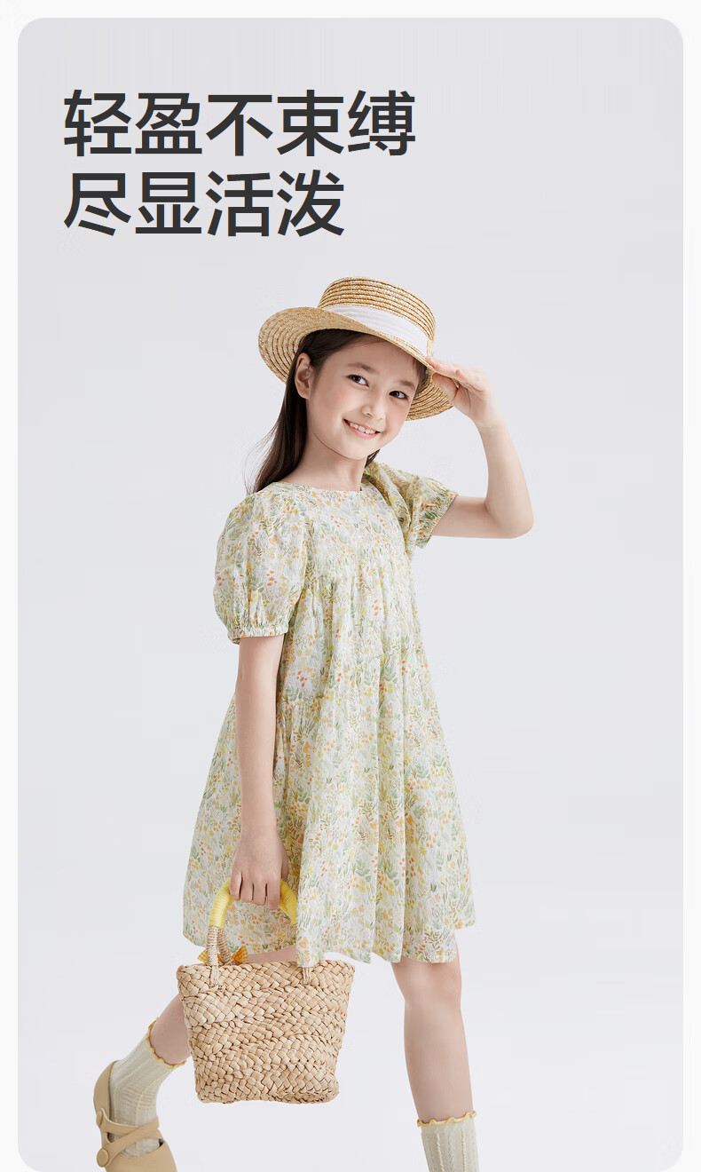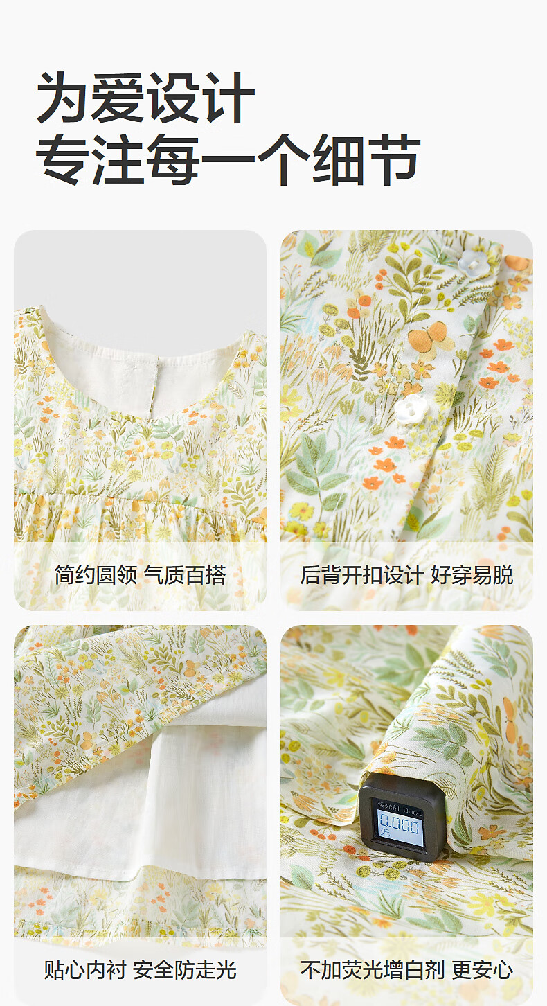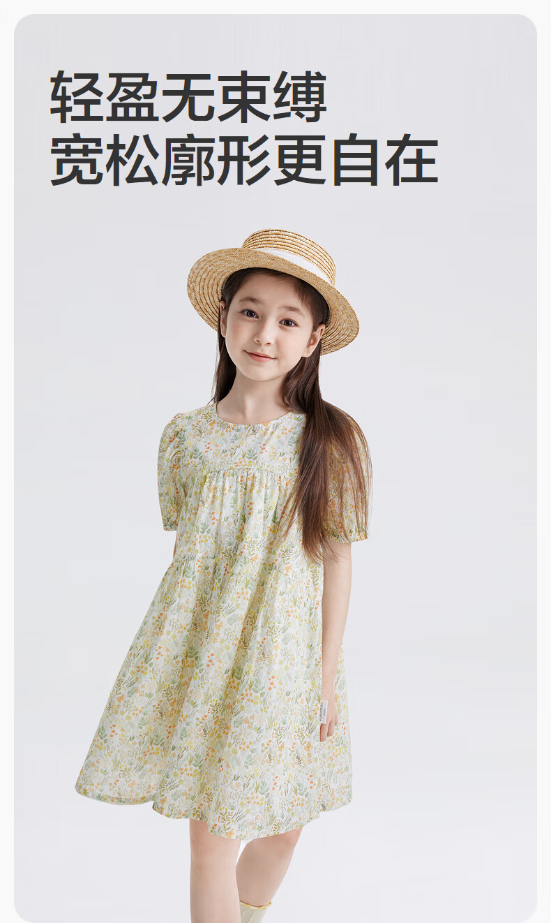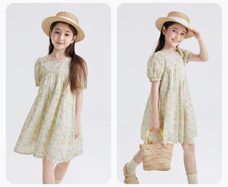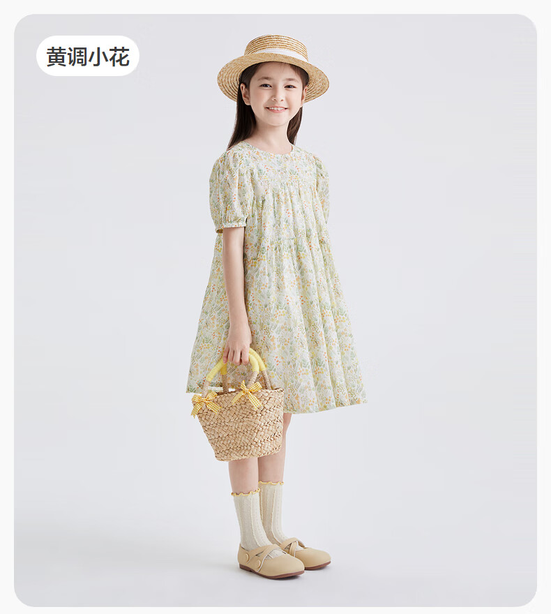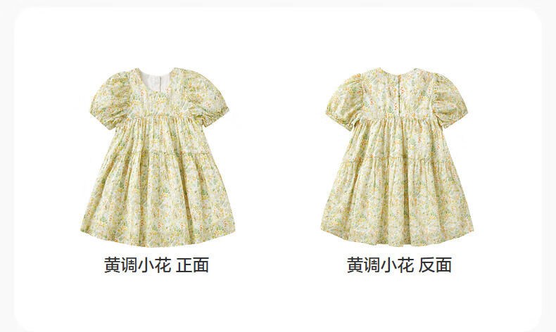 Cotton Era Girls' Woven Round Neck Short Sleeve Dress Yellow Tone Flower 130