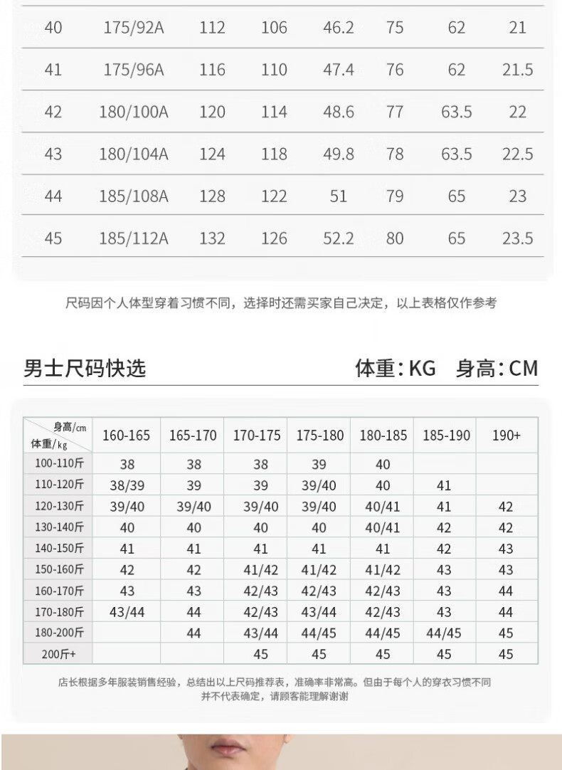 China (cm) 160-165/84-86 165-170 / 88-90 167-172 / 92-96 168-173 / 98-102 170-176 / 106-110