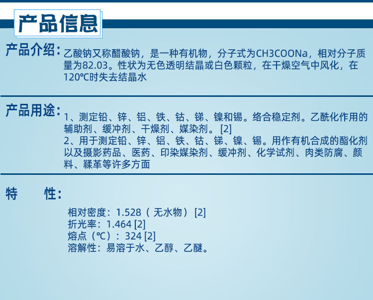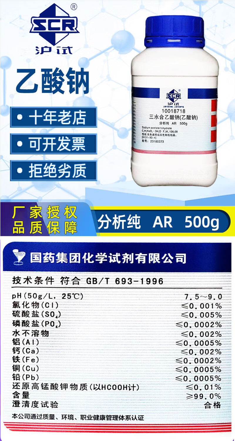 Sinopharm crystallized sodium acetate analytical pure AR chemical reagent sodium acetate trihydrate is used to dissolve water into ice small experimental raw materials Tianjin crystal 500g is used to dissolve water into ice