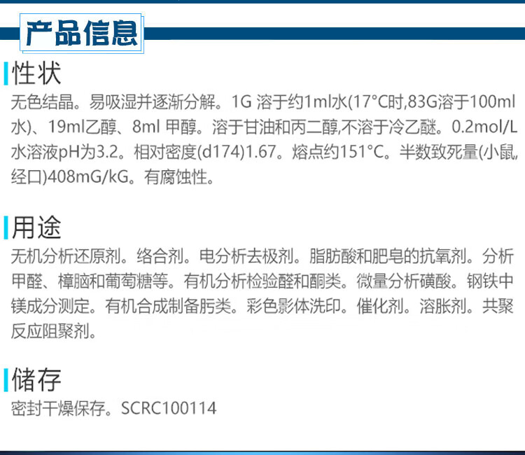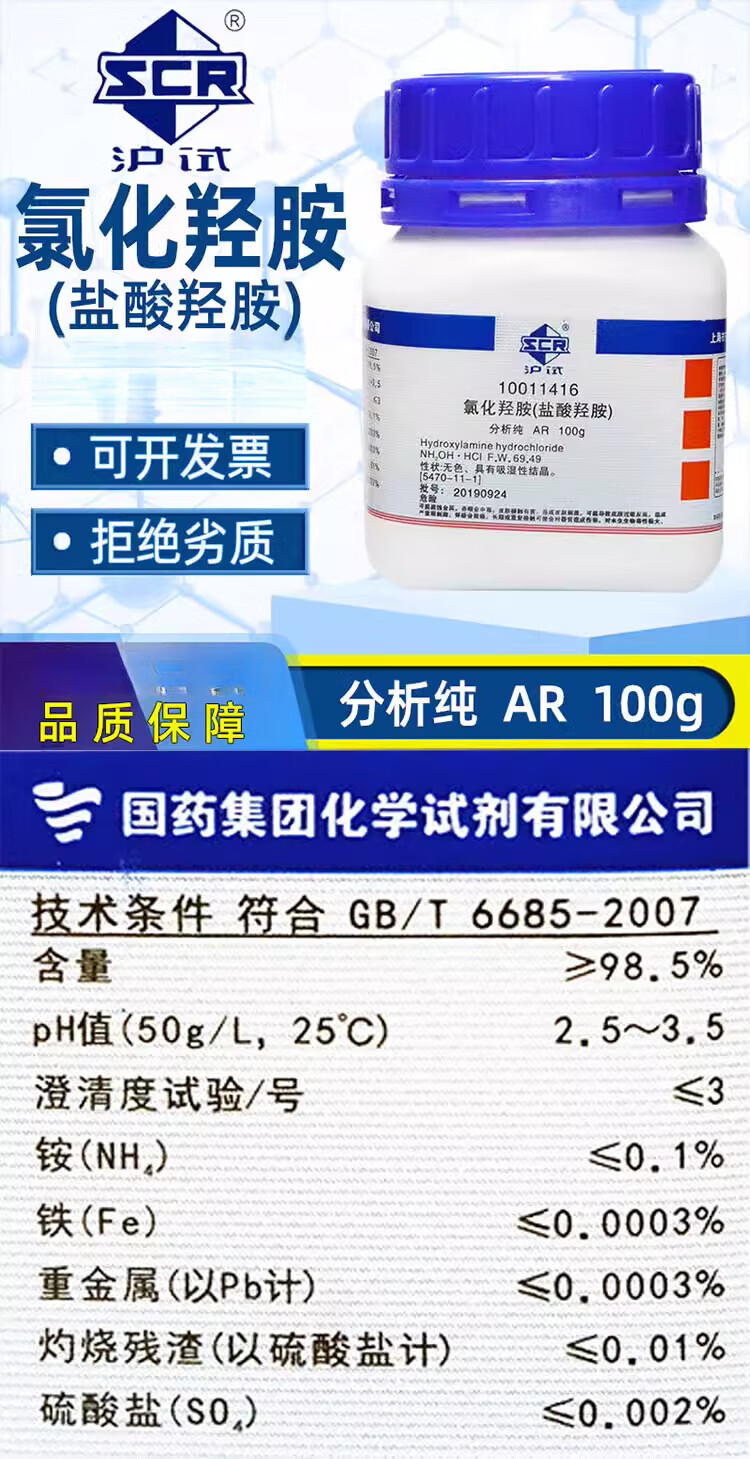 Sinopharm hydroxylamine chloride analytically pure AR chemical reagent hydroxylamine hydrochloride superior grade pure laboratory reducing agent complexing agent Sinopharm (analytically pure 100 grams)