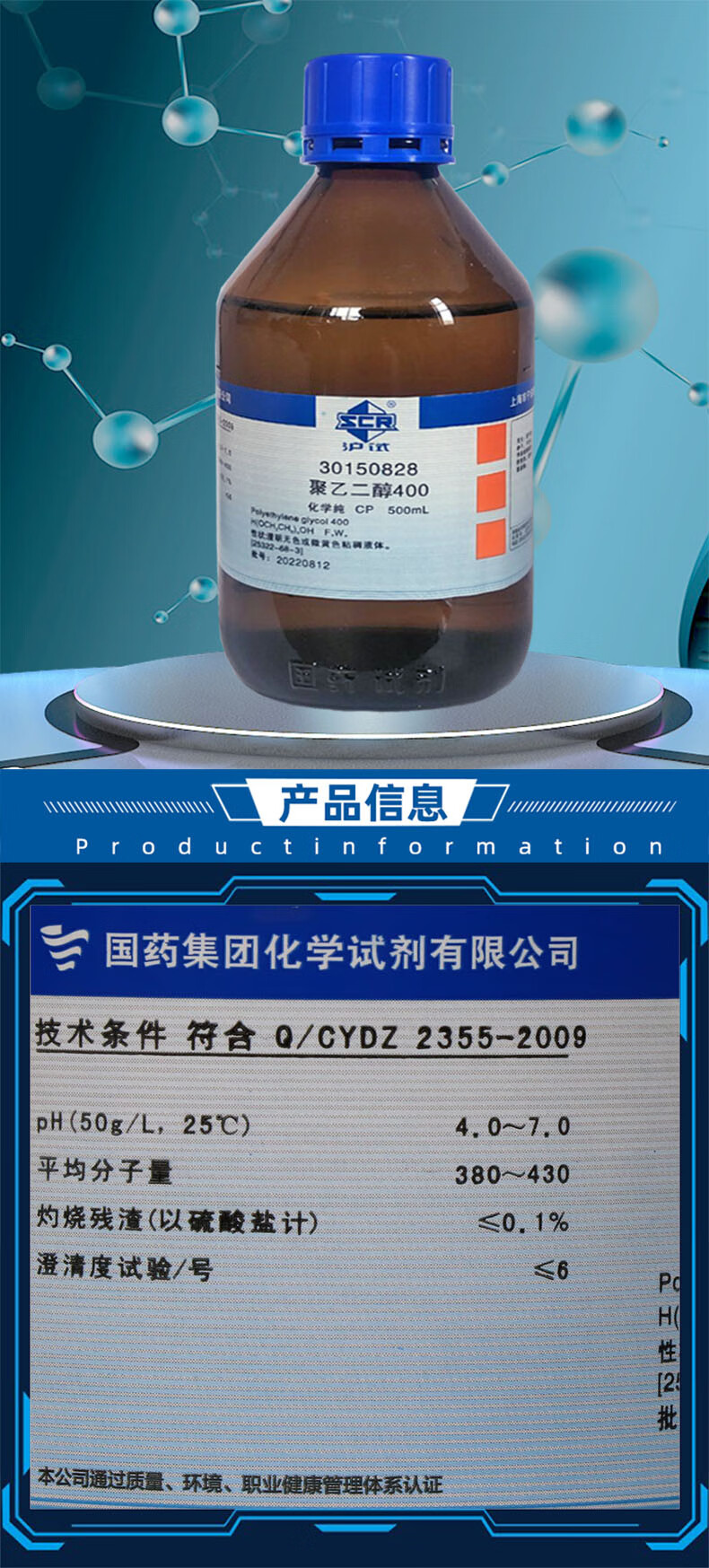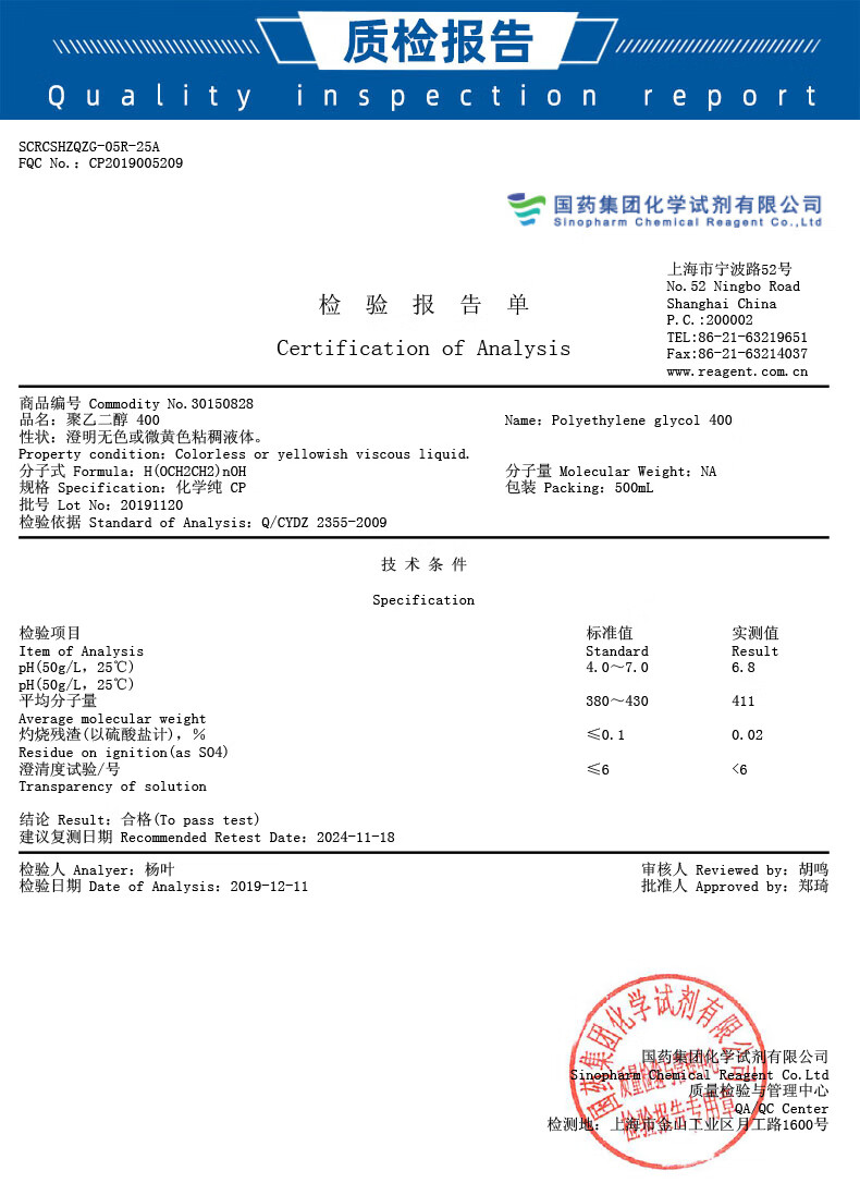 Sinopharm polyethylene glycol AR analytical pure chemical reagent laboratory PEG Dow surfactant molecular weight 400 Sinopharm brand PEG200 chemically pure 500ml