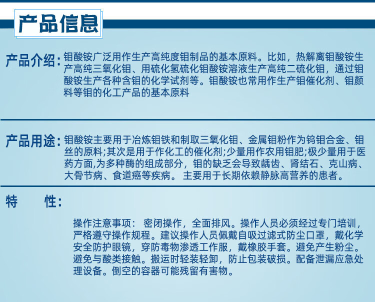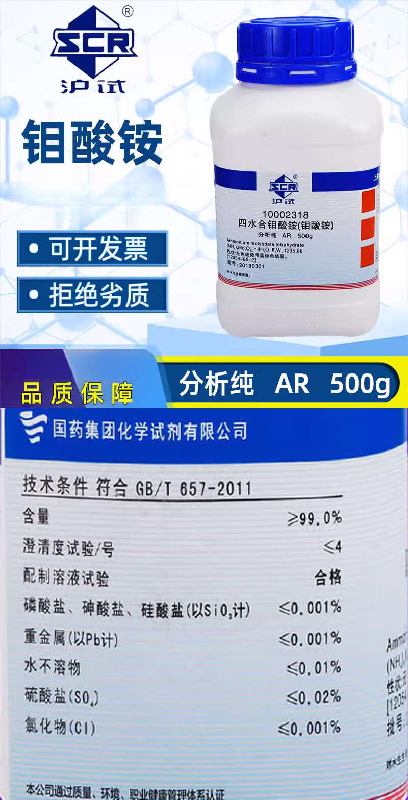 Sinopharm ammonium molybdate tetrahydrate analytically pure ammonium heptamolybdate chemical reagent hydroponic foliage fertilizer agricultural molybdenum fertilizer 500g Tianjin sub-package trial simple packaging 25g