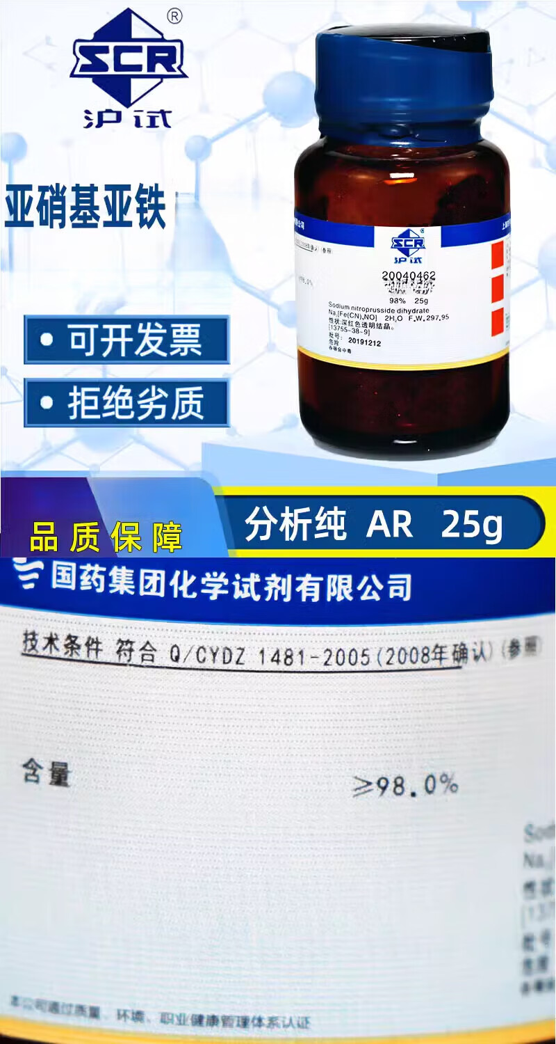 Shanghai Sinopharm Ferrous Nitrite Analytical Pure AR Chemical Reagent Shanghai Test Sodium Nitroprusside Dihydrate 25g Sinopharm Shanghai Test Sodium Nitroprusside AR Grade 25g