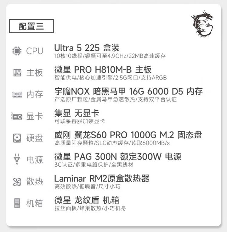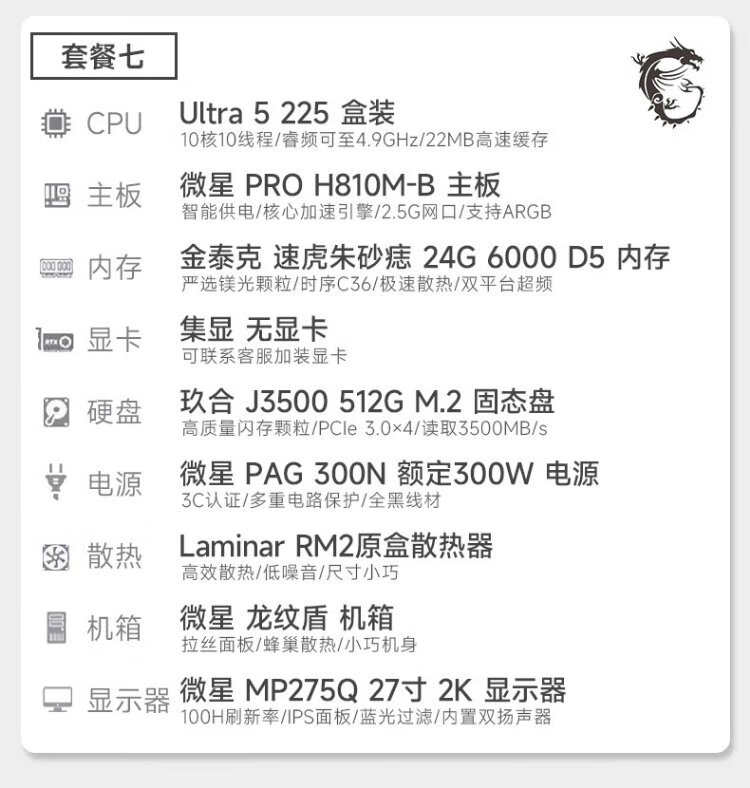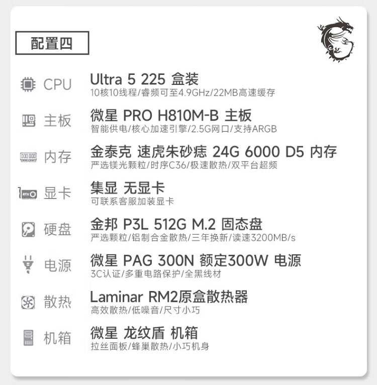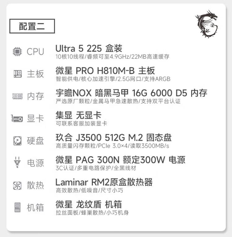 MSI (MSI) intel Ultra5 225 boxed core display barebones assembly computer complete machine home office game live broadcast designer multi-screen stock trading host DIY assembly machine complete set configuration two 225 box丨16G丨512G丨core display