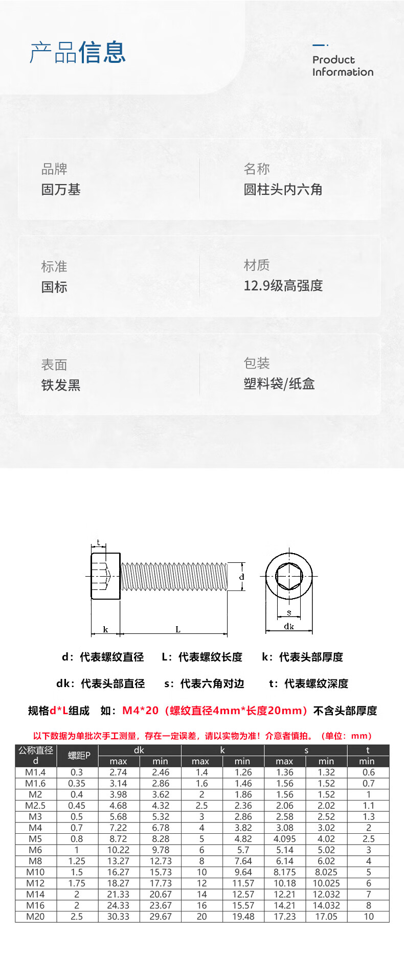 Guwanji Grade 12.9 high-strength full-thread hexagon socket screws cylindrical head bolts cup head screws national standard fasteners M12x30 (10 pieces)