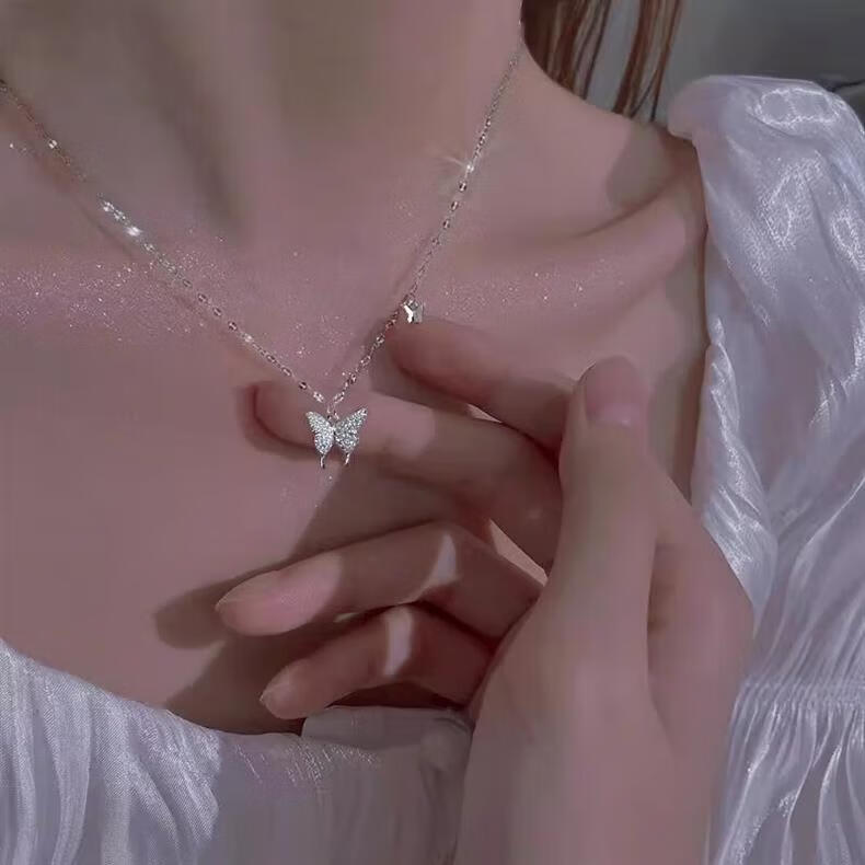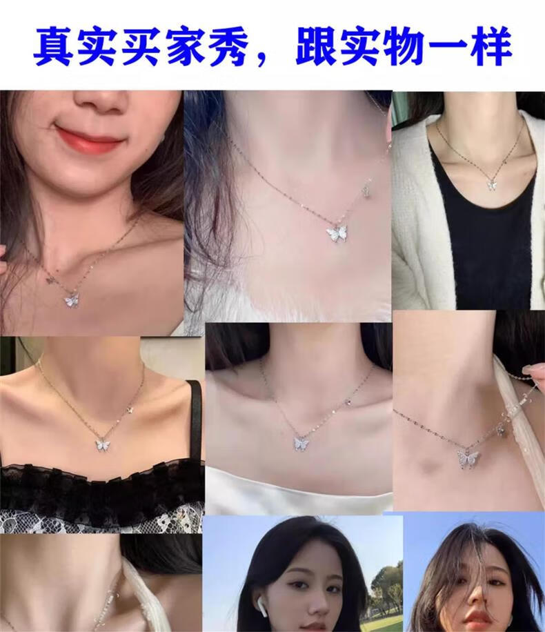 Zhou Zuyin 999 Double Layer Butterfly Necklace Women's Clavicle Chain Four-leaf Clover Pendant 520 Birthday Gift for Wife and Girlfriend White Diamond Feather to Accompany You Necklace + Gift Box