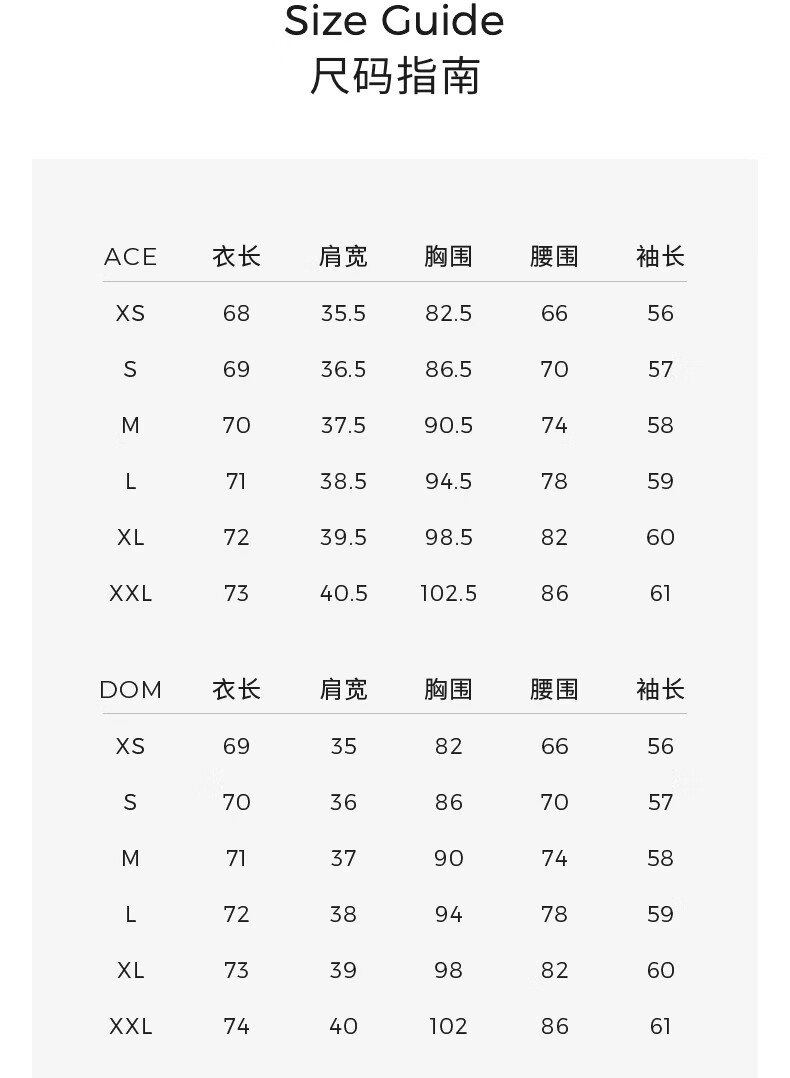 China (cm) 160-165/84-86 165-170 / 88-90 167-172 / 92-96 168-173 / 98-102 170-176 / 106-110