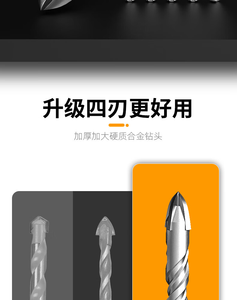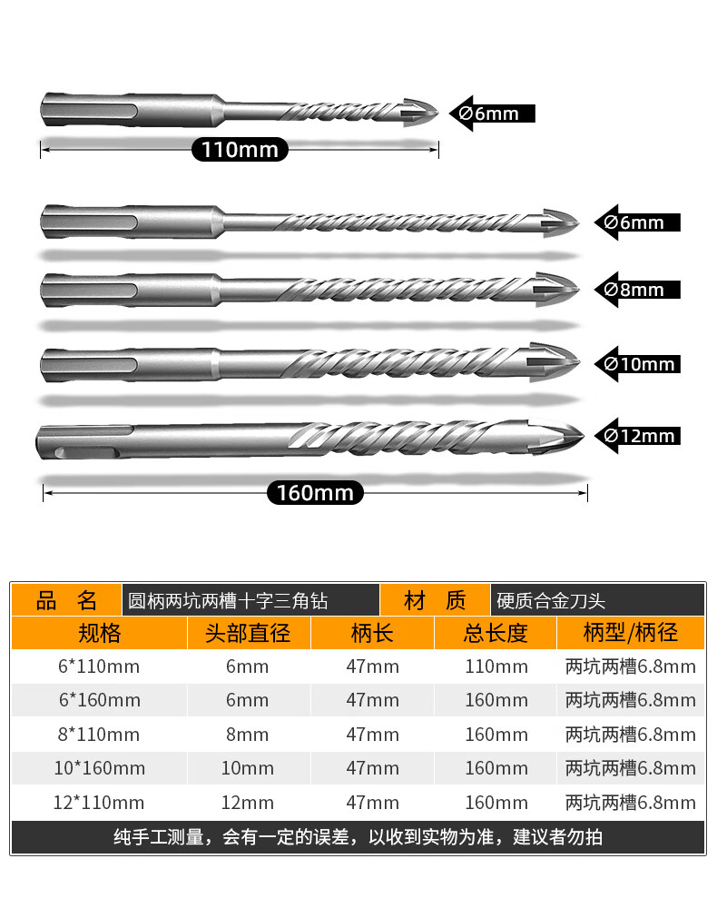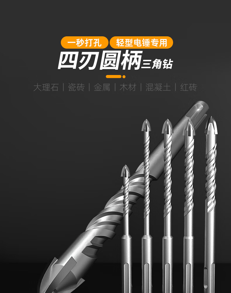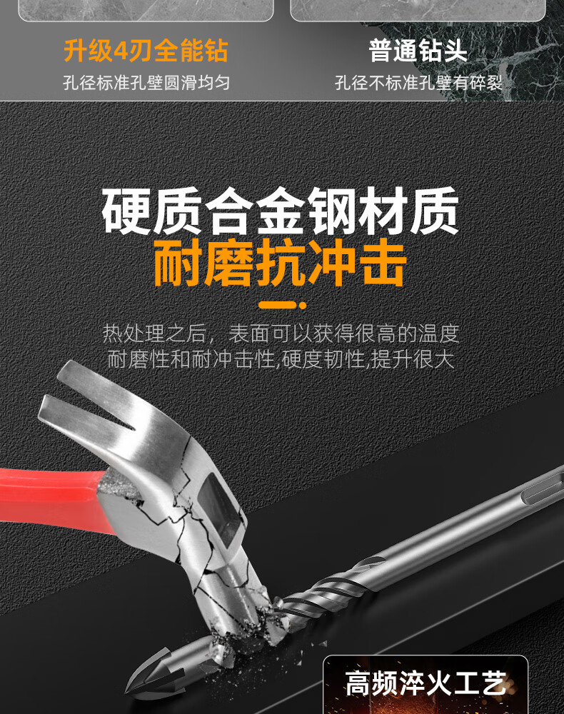 MeiKeLa tungsten steel alloy drill bit for ceramic tiles, cross electric hammer impact drill, round handle, two pits, two slots, four-edged triangle drill, upgraded four-edged, full Specifications, 5-pack