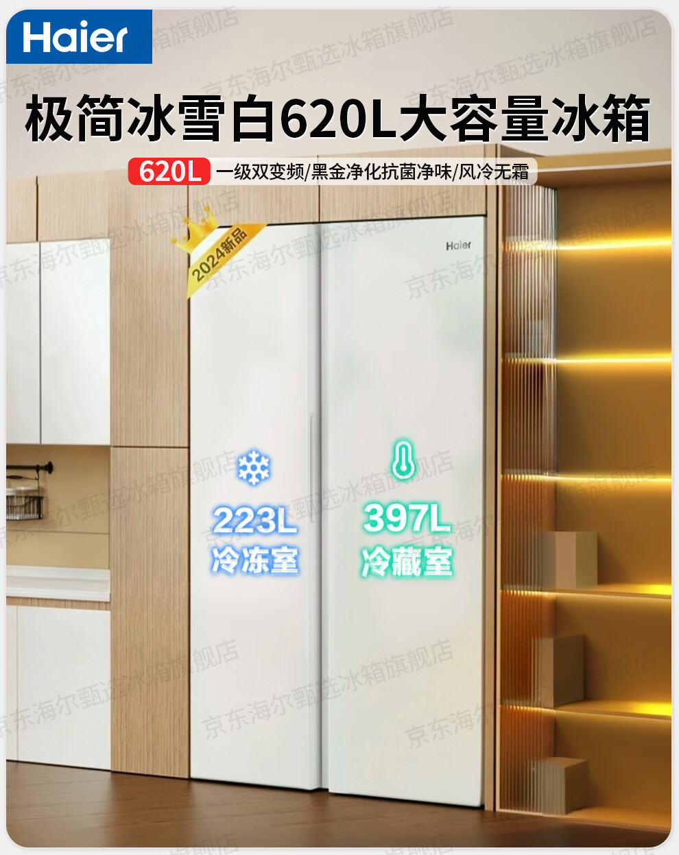 Haier refrigerator 620 liters double door side-by-side refrigerator air-cooled frost-free first-class energy efficiency dual-inversion large-capacity white refrigerator State subsidy Ice and snow white + first-class dual inversion + black gold purification and antibacterial + 90 door hover