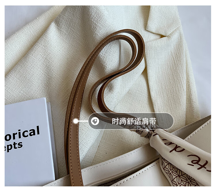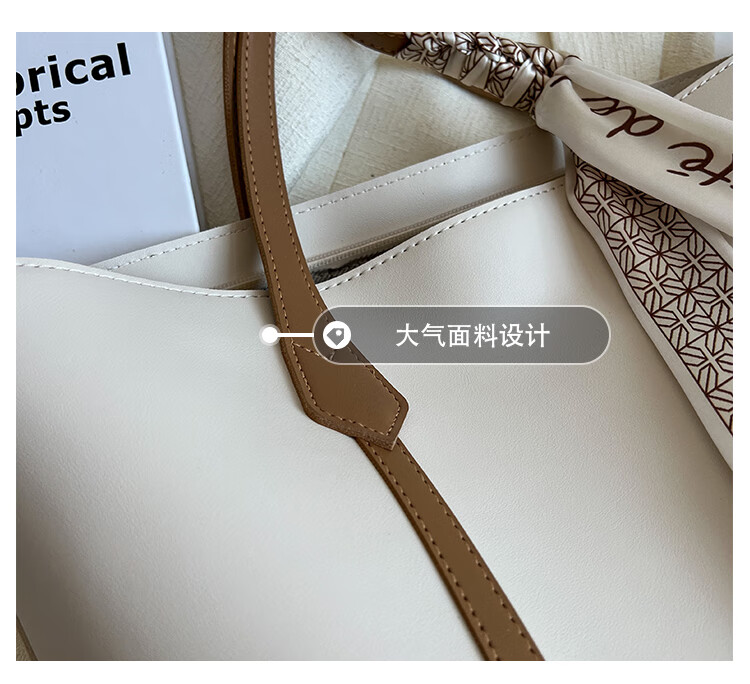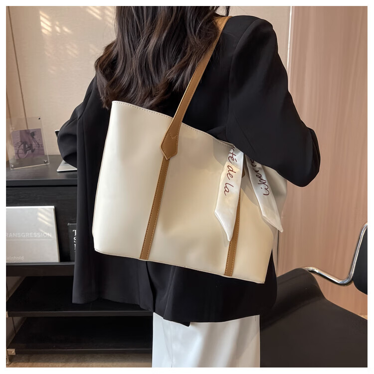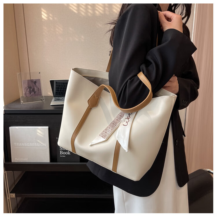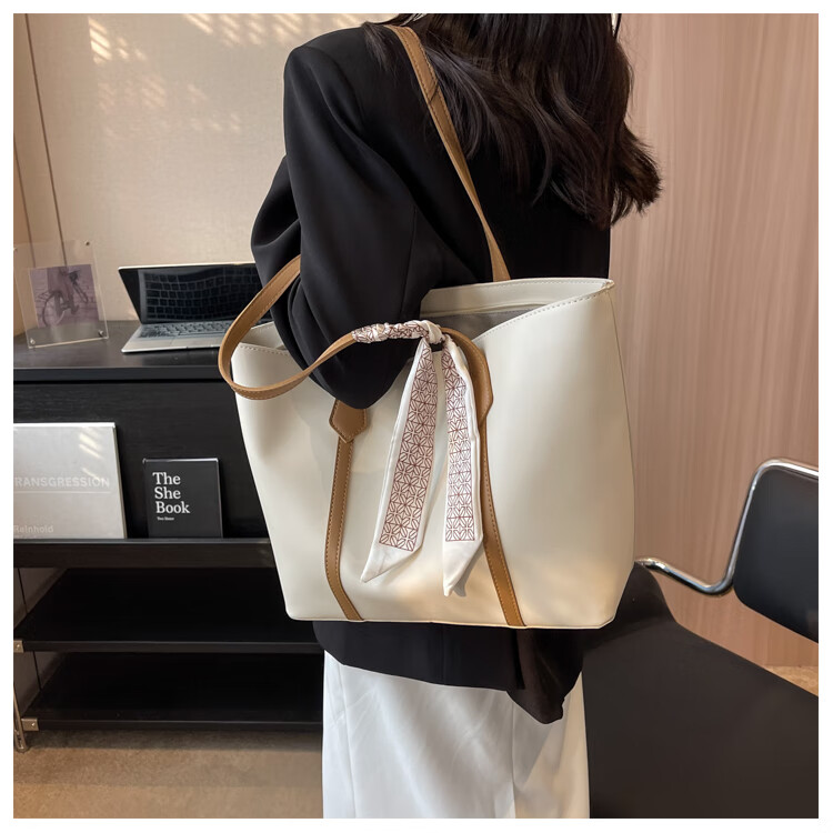 Bai Qixin Tote Bag Large Capacity Commuting Large Bag Women's Fashionable Simple Tote Bag Retro Shoulder Handbag Simple Tote Bag White with Brown + Ribbon