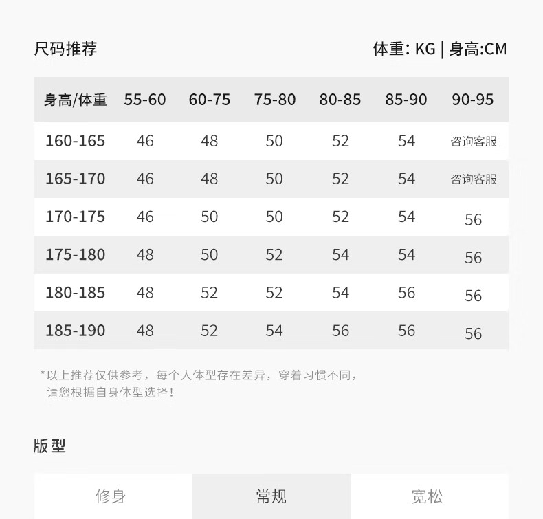 China (cm) 160-165/84-86 165-170 / 88-90 167-172 / 92-96 168-173 / 98-102 170-176 / 106-110
