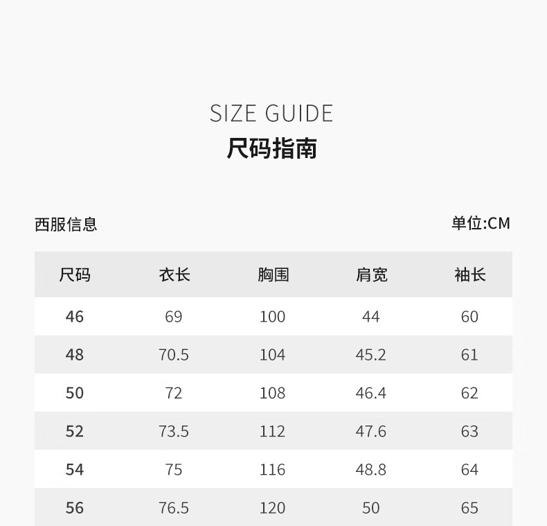 China (cm) 165 / 88-90 170 / 96-98 175 / 108-110 180 / 118-122 185 / 126-130