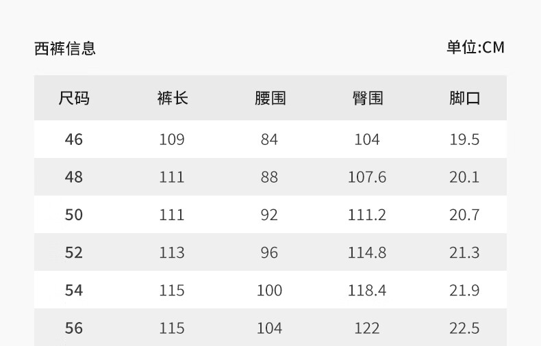 Outseam (cm) 99 cm 101.5 cm 104 cm 106.5 cm 109 cm