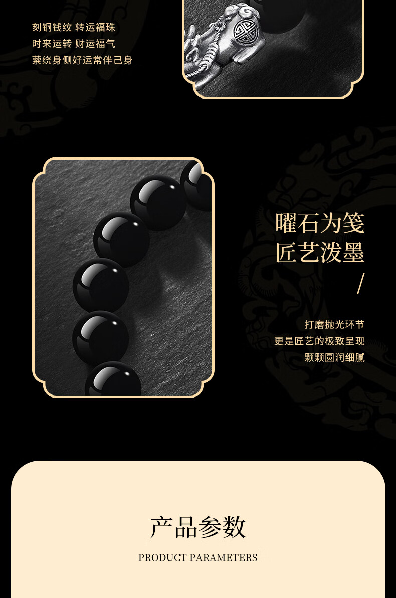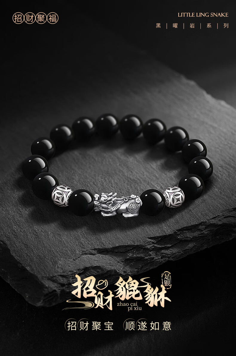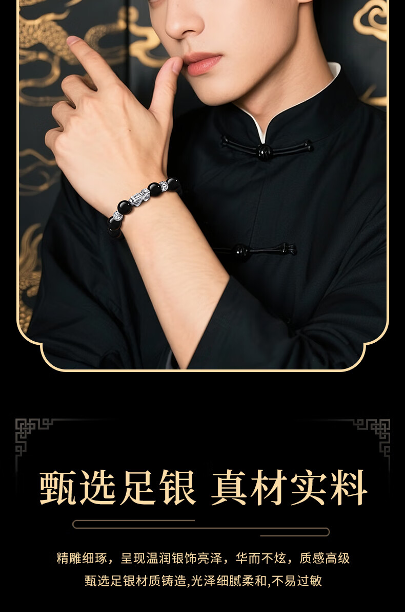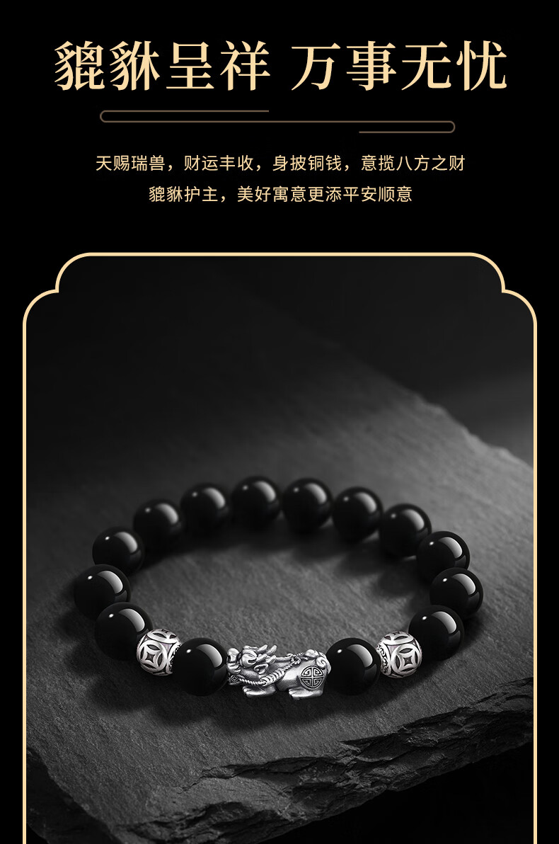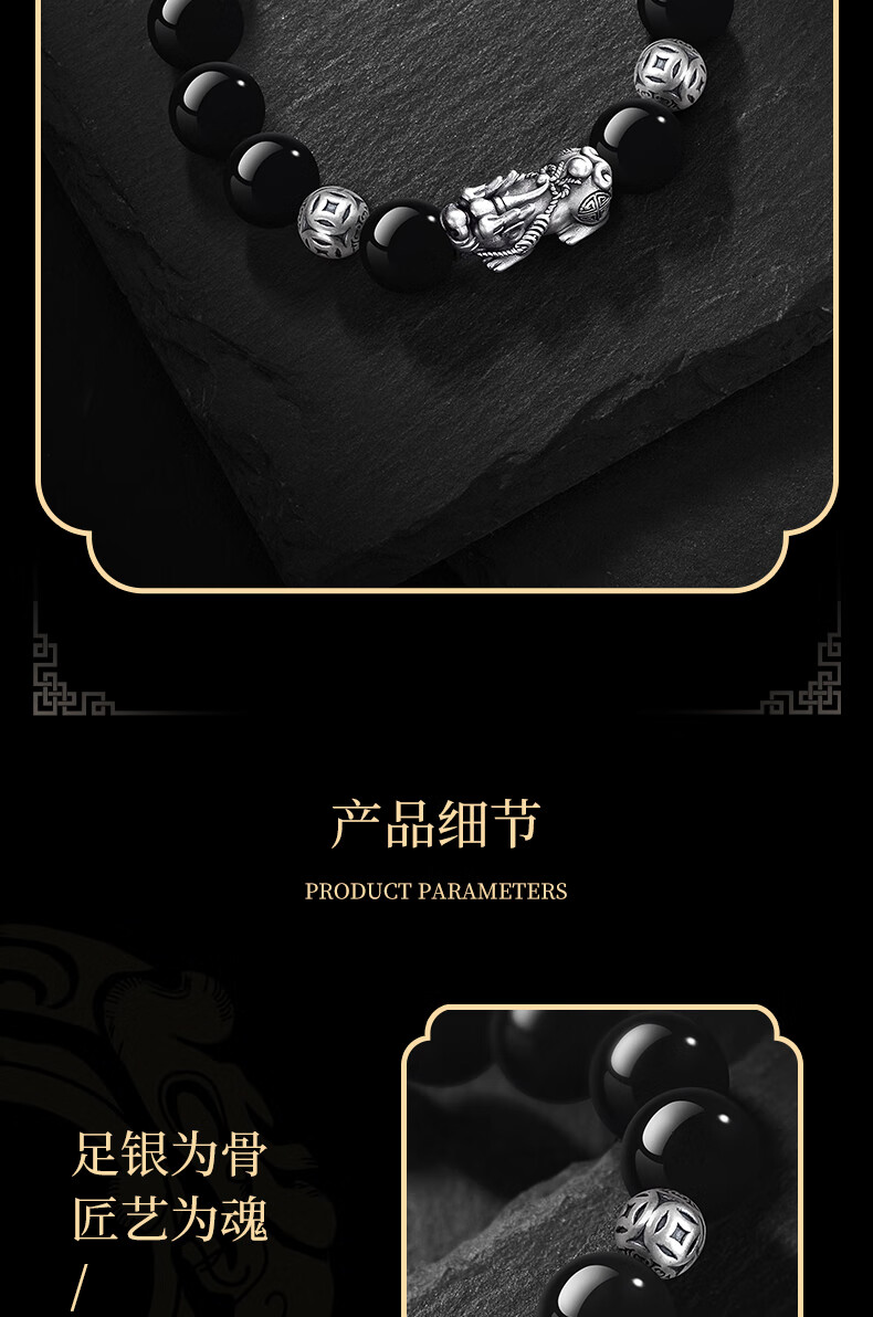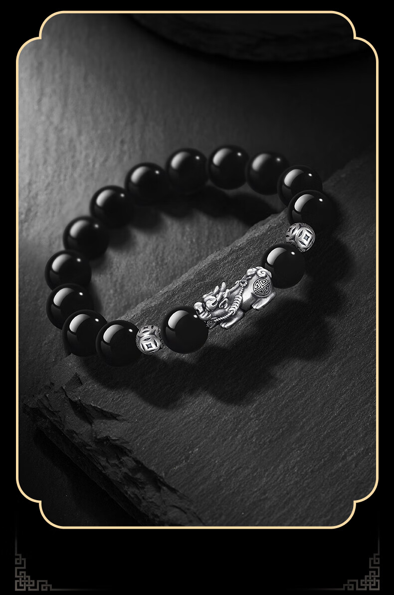 Chinese Gold Lucky Pixiu Pure Silver Bracelet Men's Transfer Beads Obsidian Bracelet Boys Birthday Gift Boyfriend Husband Pure Silver Pixiu Bracelet-Obsidian 12mm