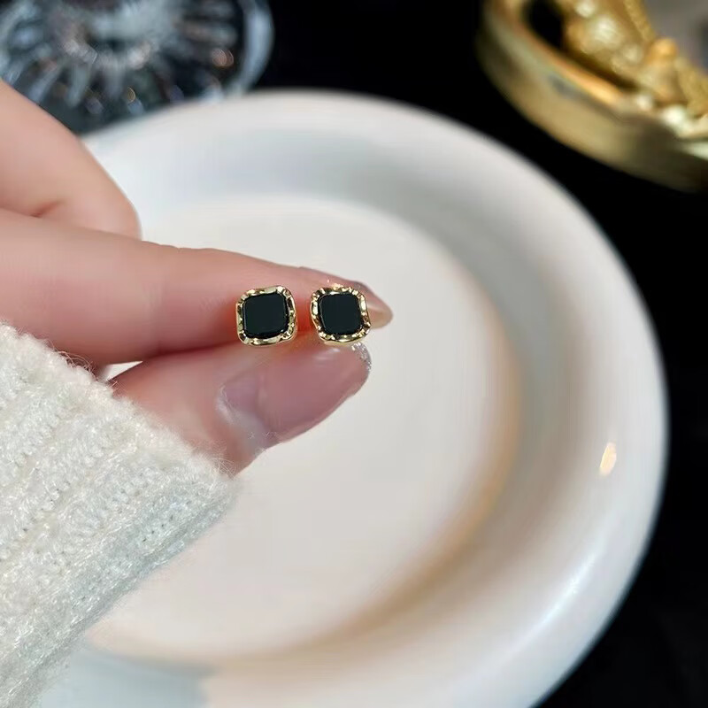 Yican S925 Silver Needle Black Square Small Earrings for Ear Hole Sleeping Earrings Small, Fashionable and Exquisite Earrings S925 Silver Needle Black Square Earrings