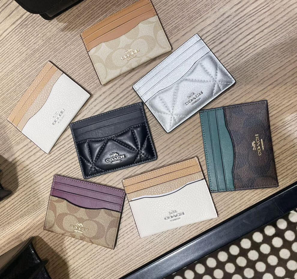 COACH multi-card slot keychain pendant ID cowhide printed card holder milk tea color logo stitching pleated card holder