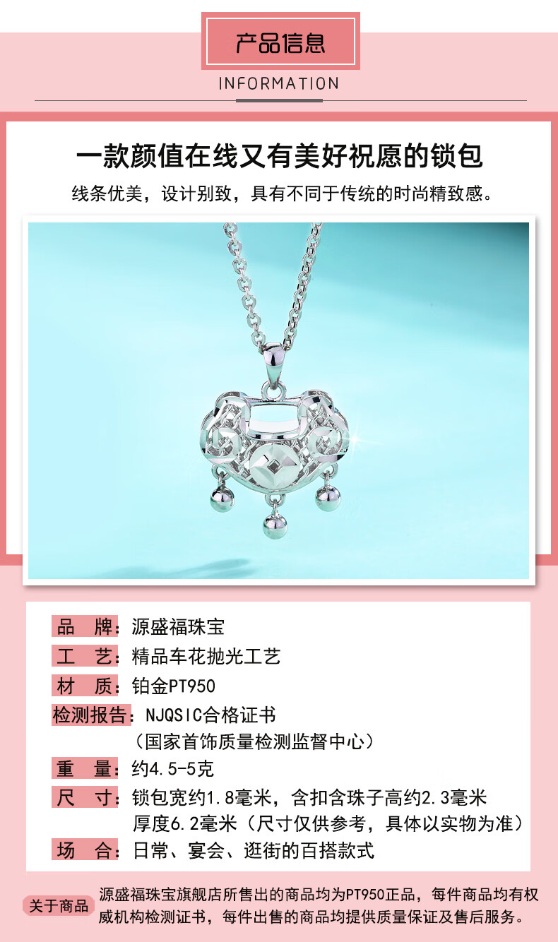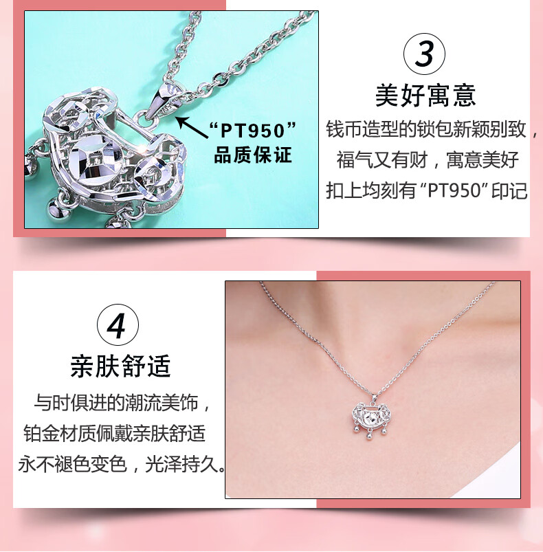 Yuan Shengfu's new PT950 fashionable copper coin lock bag platinum pendant platinum bell lock bag necklace gift 4.56 g