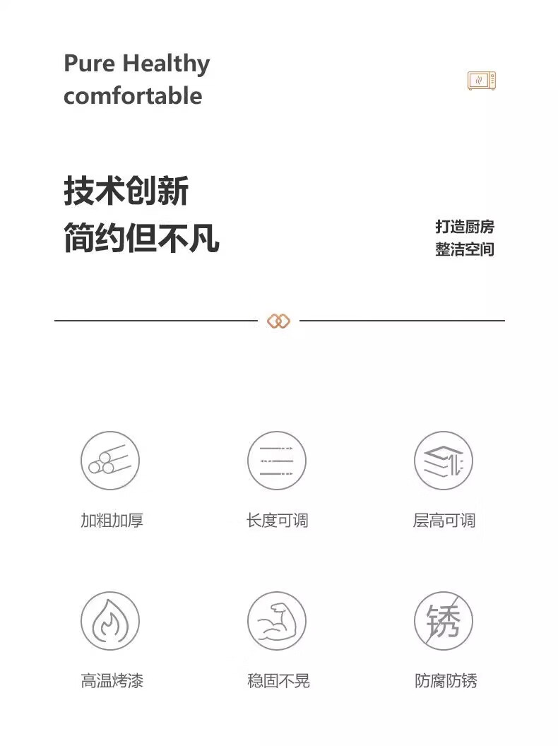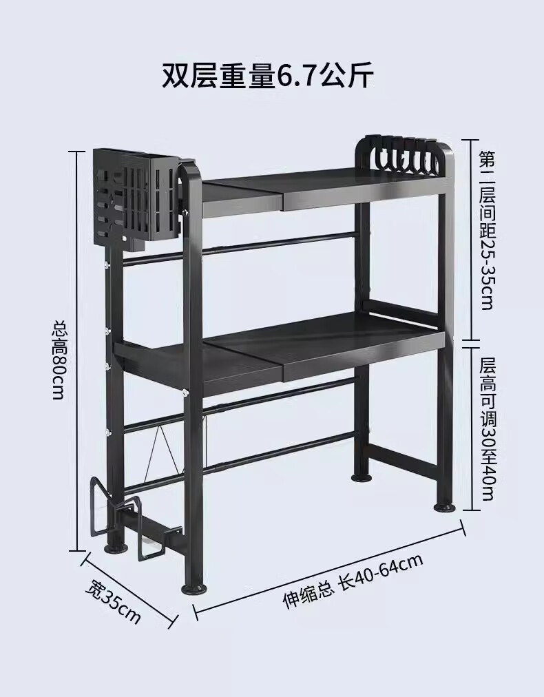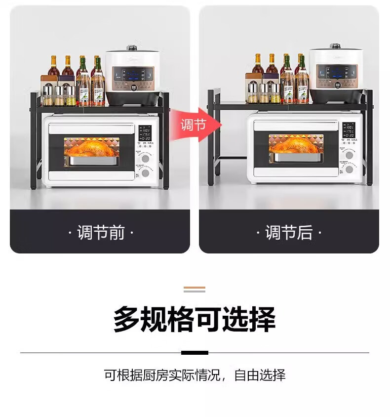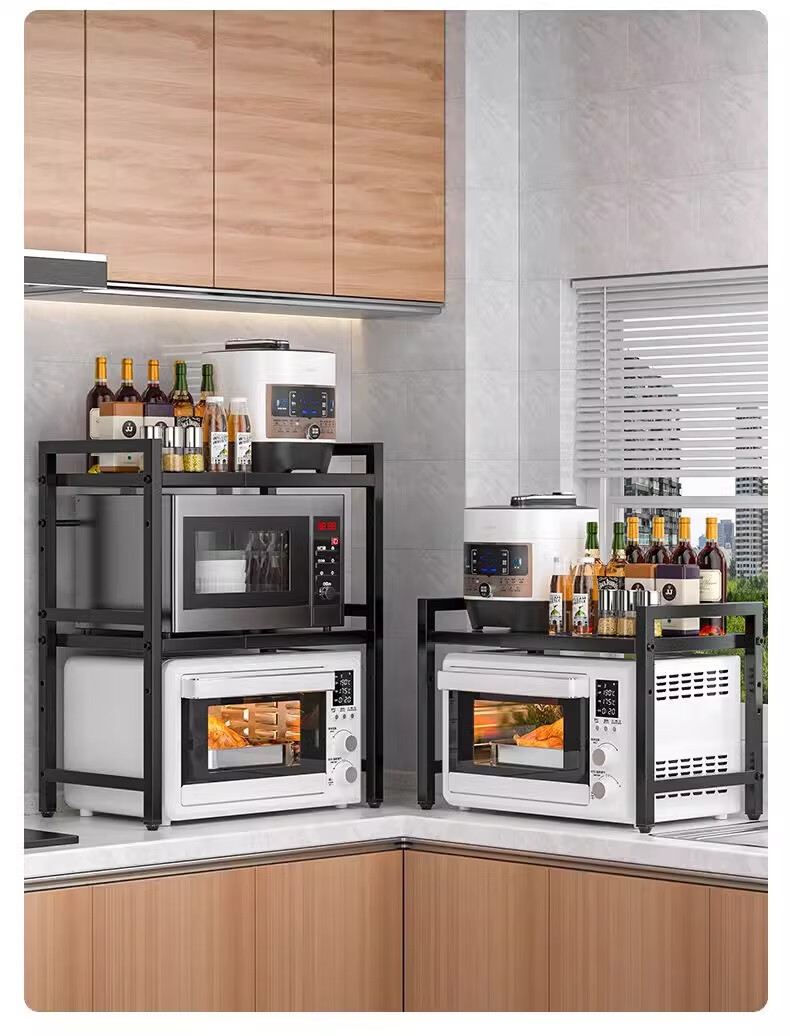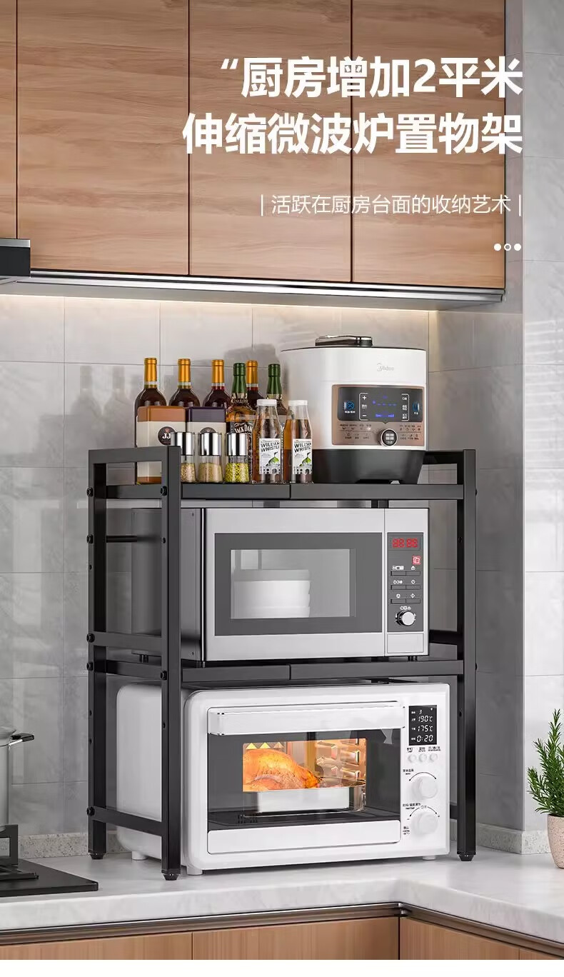 Kunfeng kitchen microwave oven rack retractable oven rack household double-layer countertop tabletop rice cooker storage bracket black-single layer smaller size not retractable