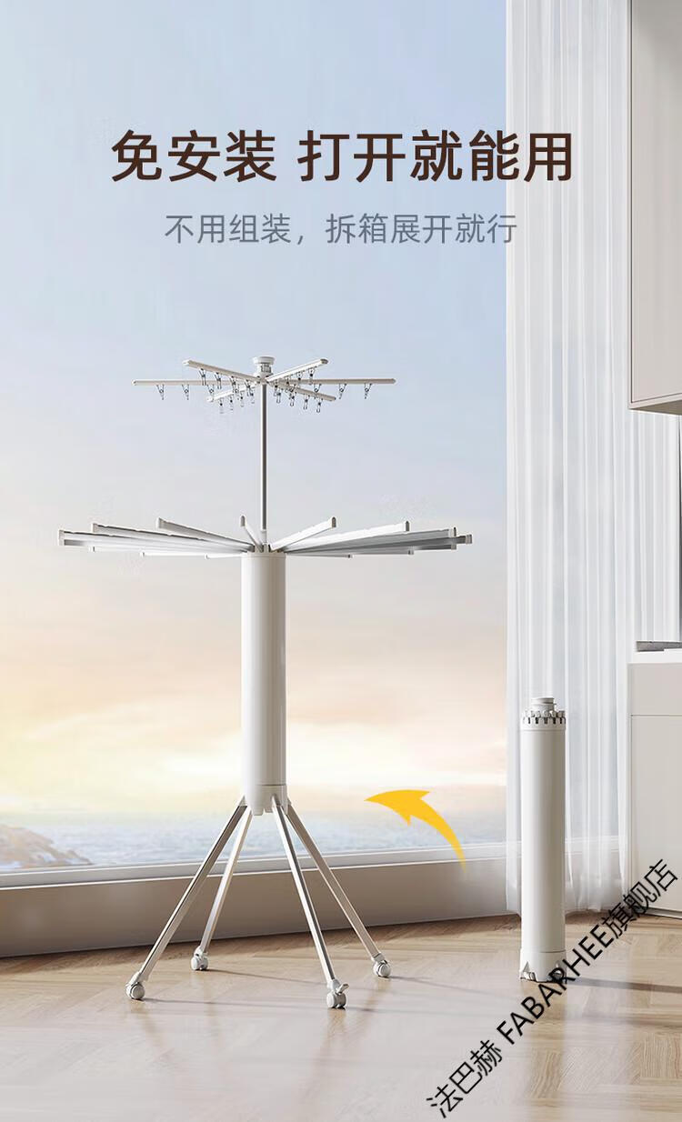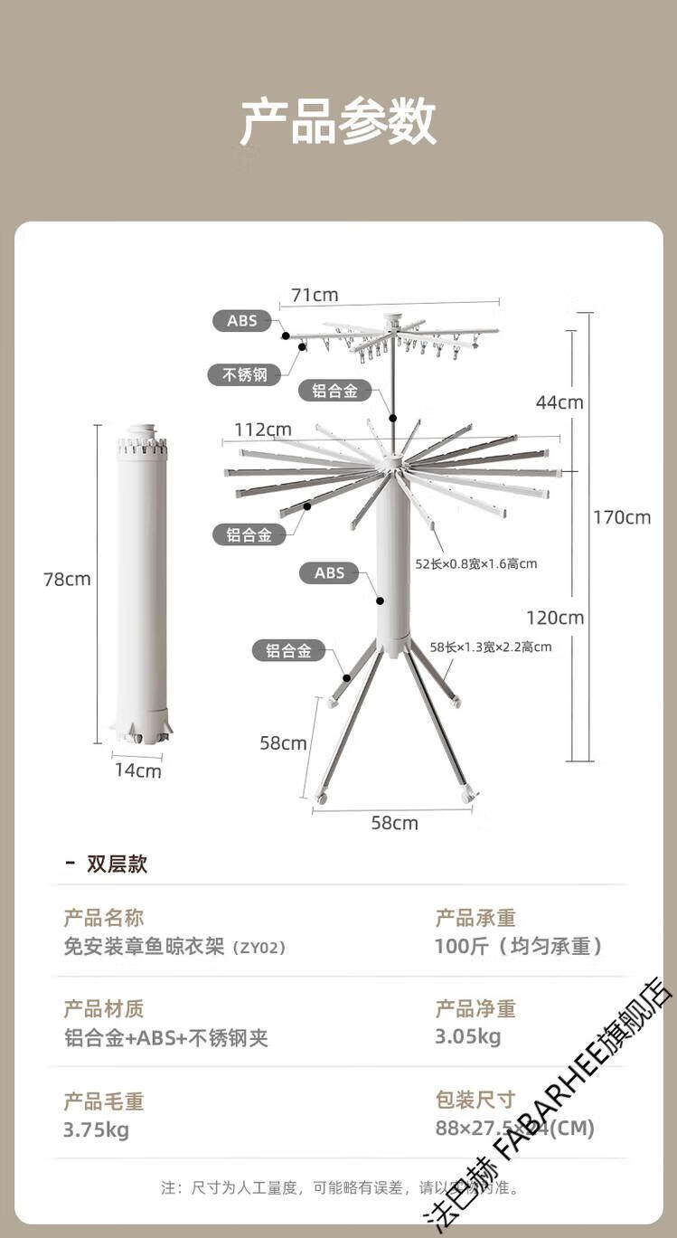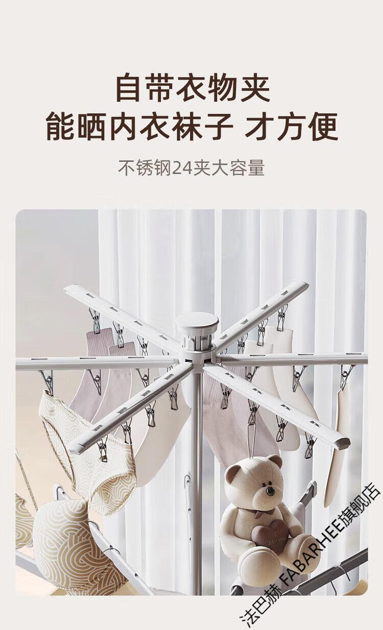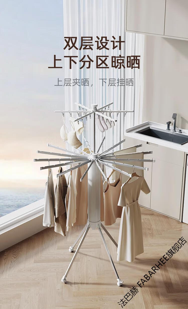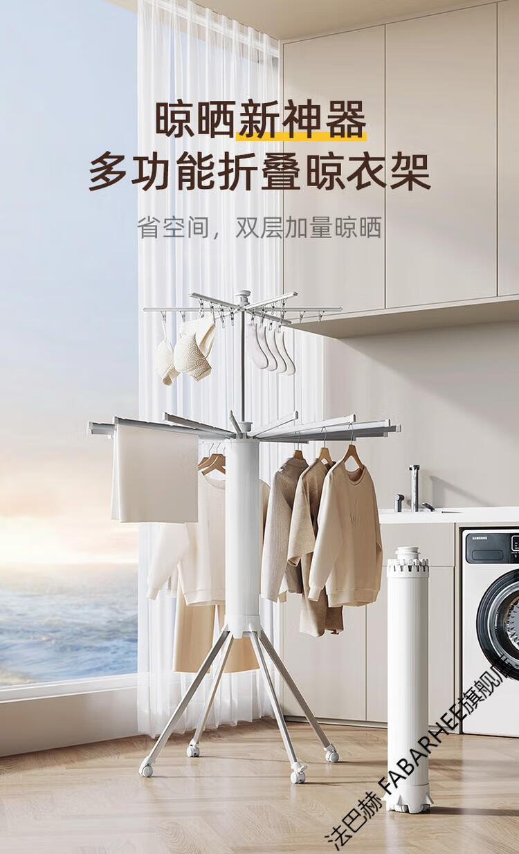 FABARHEE folding clothes drying rack floor-standing balcony indoor home octopus installation-free removable does not take up space for drying quilt rack double-layer model 24 clips + 16 poles four-legged wheels