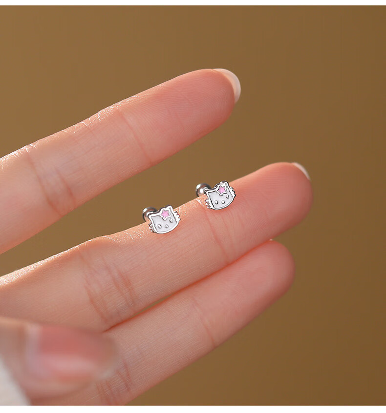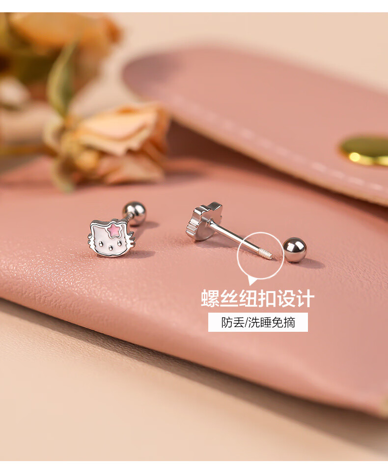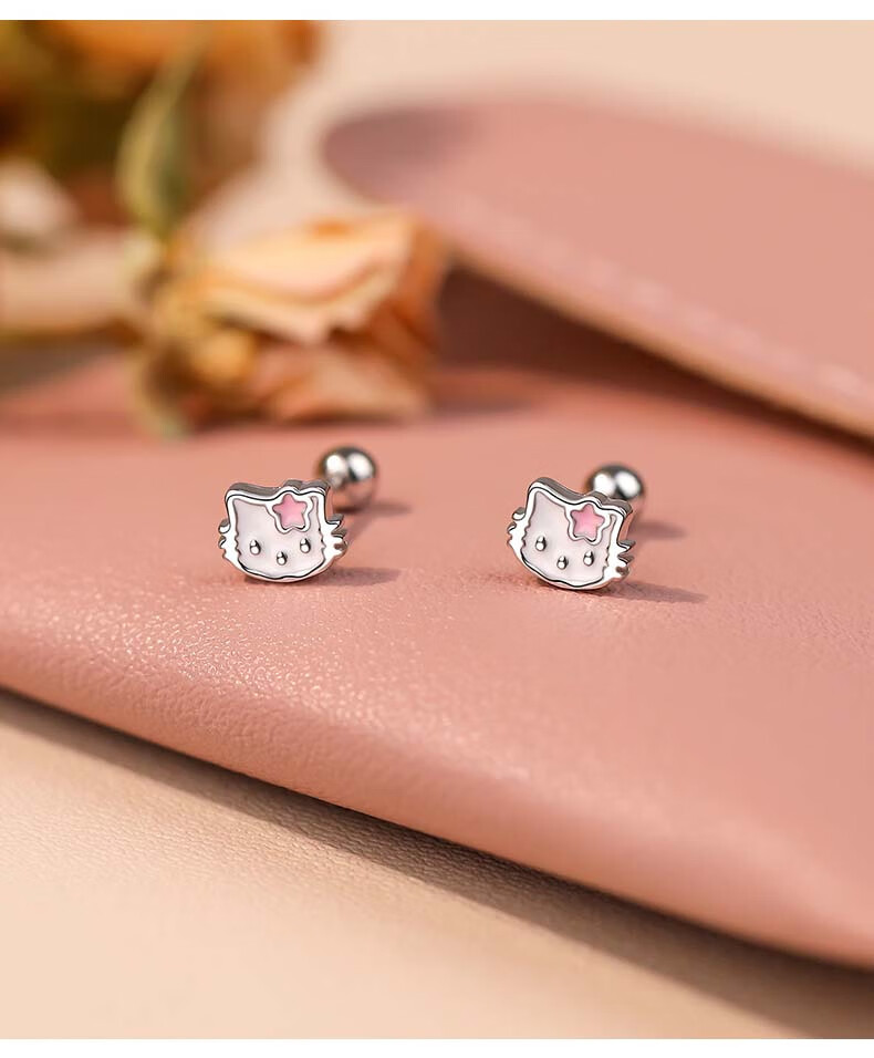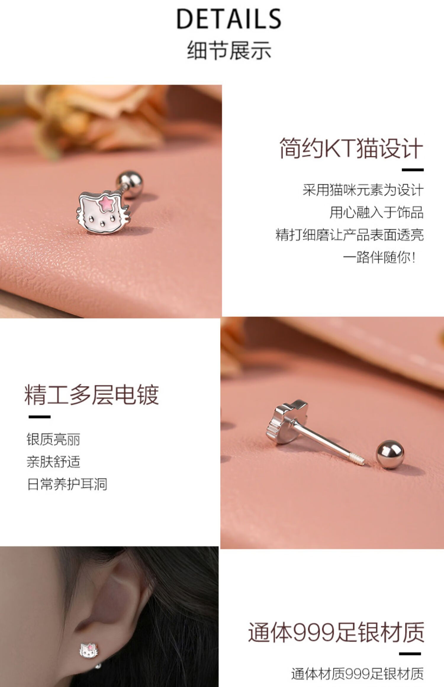 Senqi S999 Pure Silver KT Cat Screw Earrings for Girls Cute and Sweet Earrings Pure Silver Ear Bone Children's Ear Accessories E3555KT Cat Screw Earrings 999 Silver