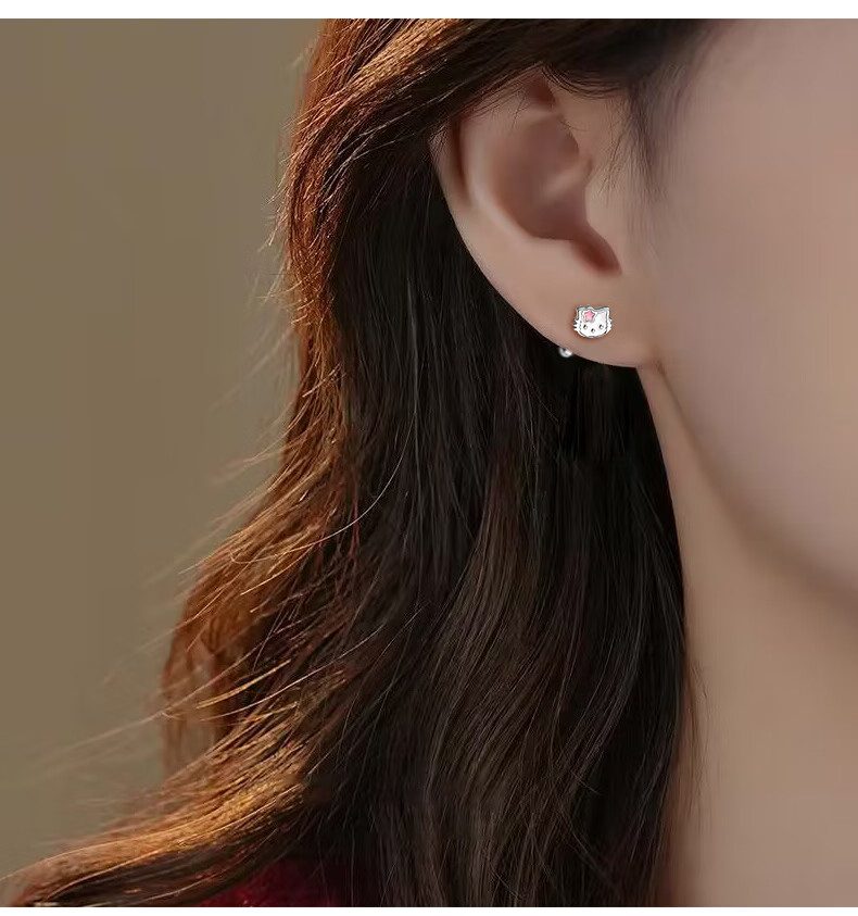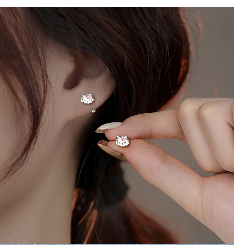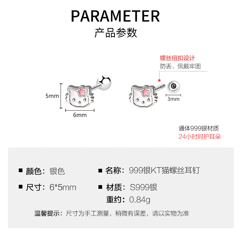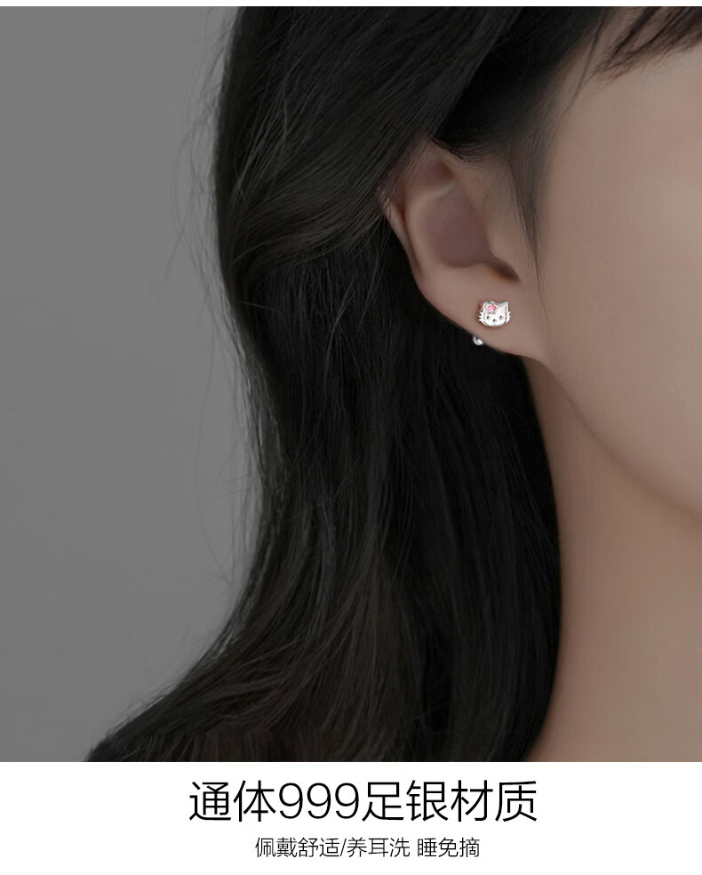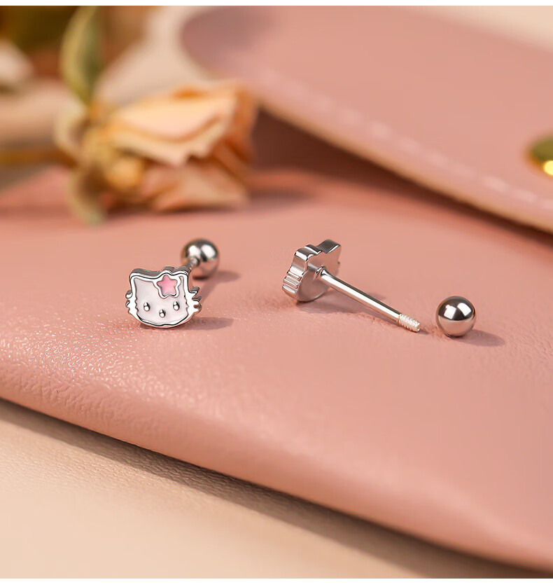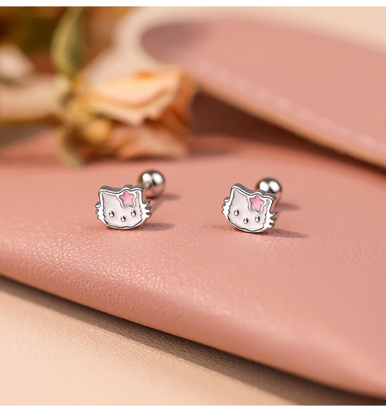 Senqi S999 Pure Silver KT Cat Screw Earrings for Girls Cute and Sweet Earrings Pure Silver Ear Bone Children's Ear Accessories E3555KT Cat Screw Earrings 999 Silver