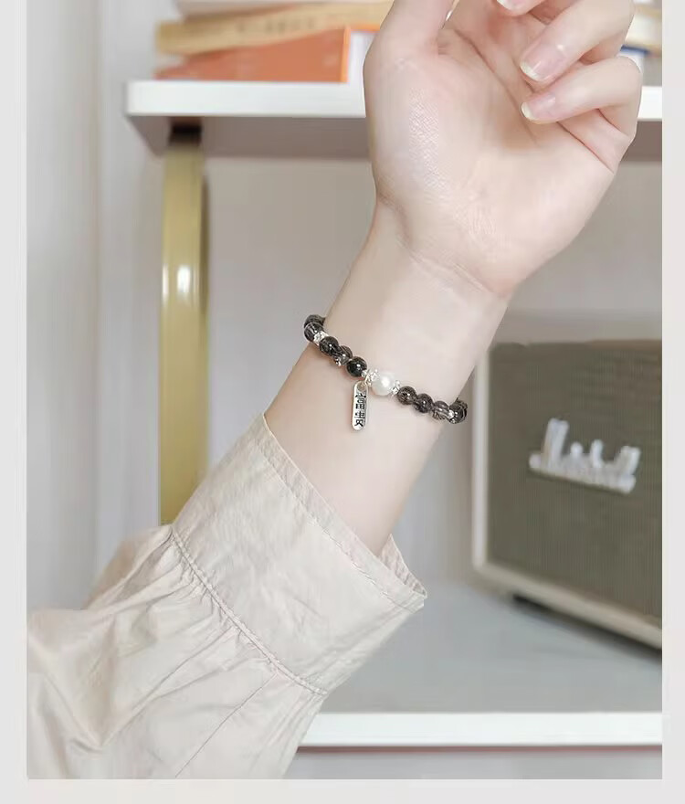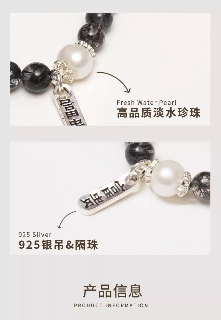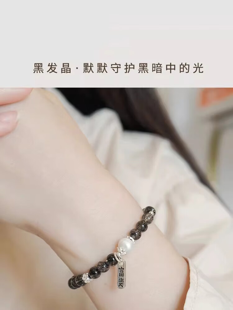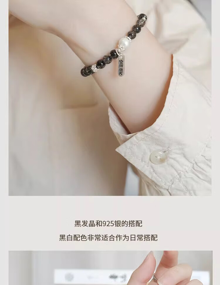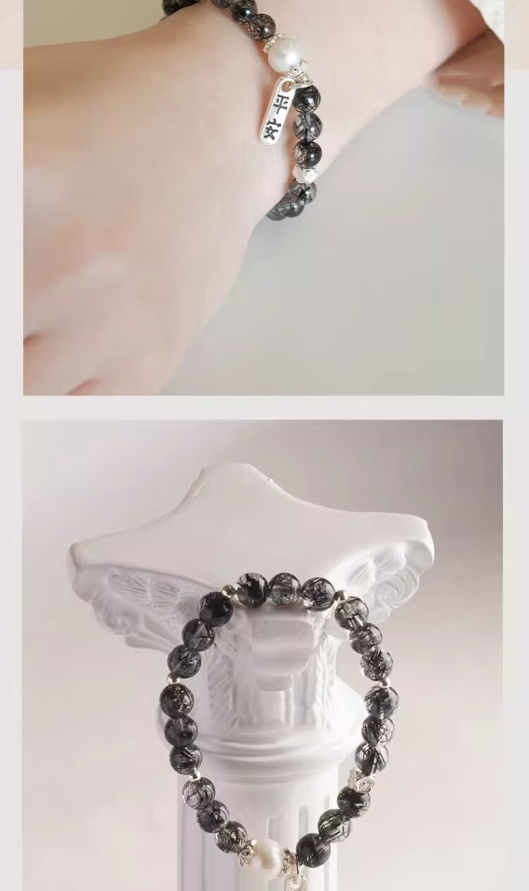 BOSFRU Black Hair Crystal Bracelet Chinese Style Thin Chain Freshwater Pearl Sterling Silver Pendant Niche Design Gift for Women Suitable for Clean Hands 14cm