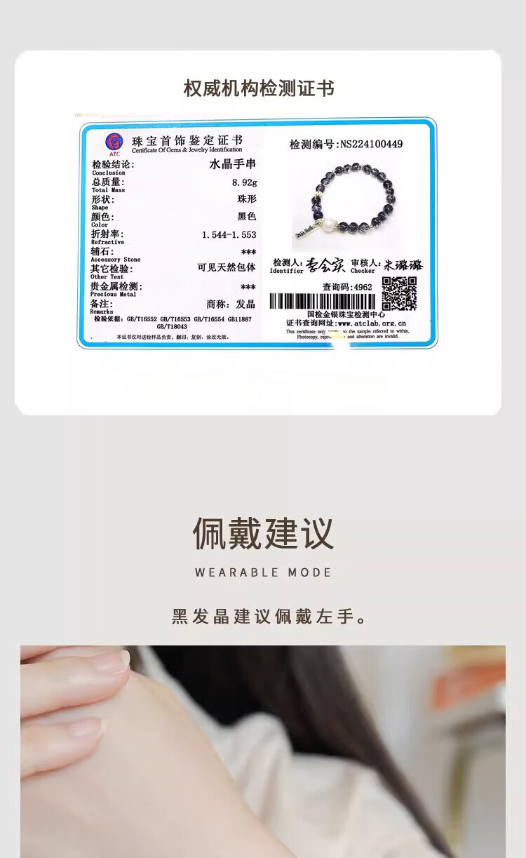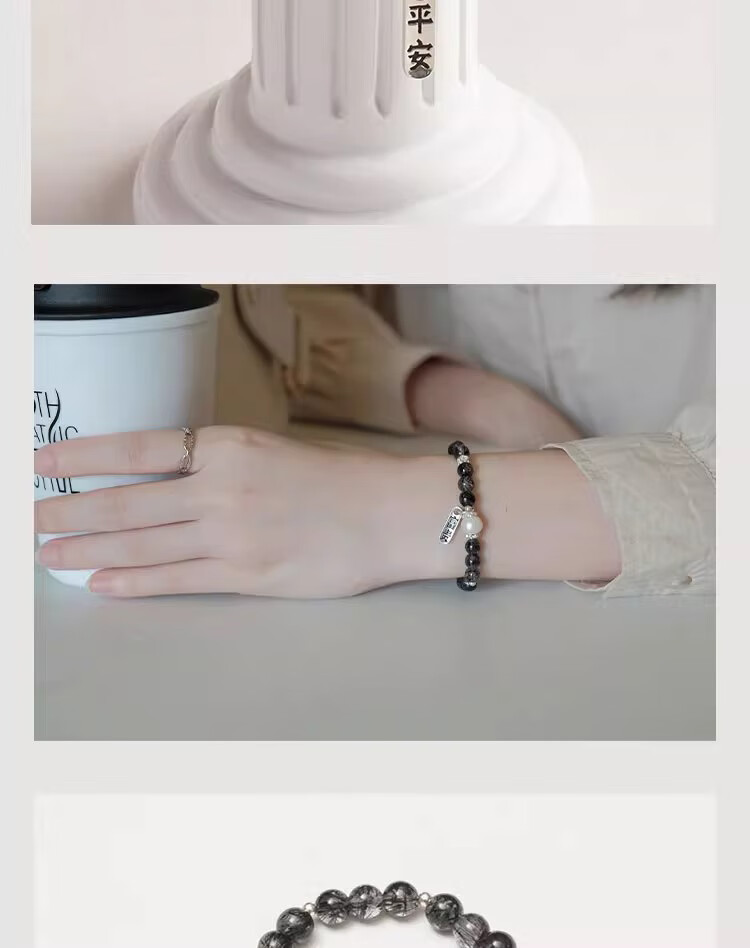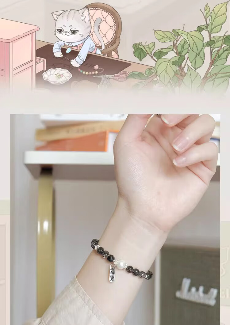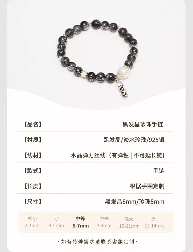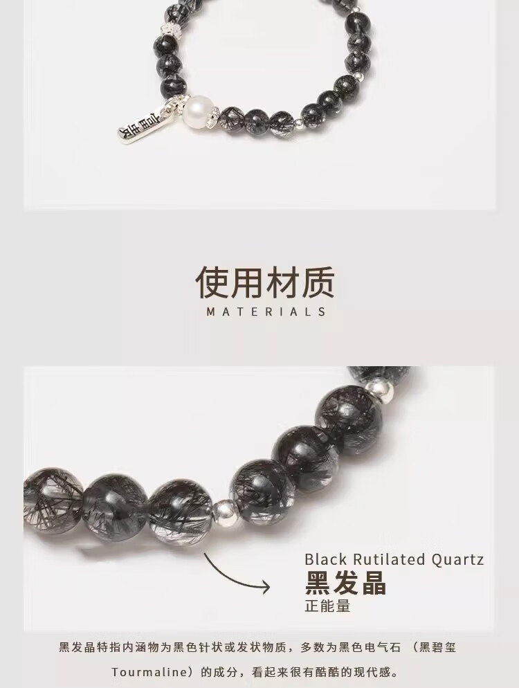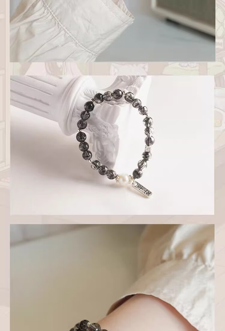 BOSFRU Black Hair Crystal Bracelet Chinese Style Thin Chain Freshwater Pearl Sterling Silver Pendant Niche Design Gift for Women Suitable for Clean Hands 14cm